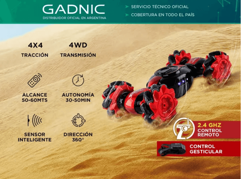 ¡Gadnic presenta su nueva línea de autos a control remoto tipo TWIST! Este auto 360 cuenta con tracción en las 4 ruedas, un potente motor vortex de alto rendimiento y un gran despeje del suelo que le permiten atravesar obstáculos que otros autos no pueden. Su tamaño es más que aconsejable para niños y adultos. Sus ruedas de goma de especial agarre y su resistencia al agua lo convierte un vehículo único muy divertido que permite variar los escenarios donde jugar más tiempo. ¡Además, su tecnología twist-car hace que sea el más versátil y elegido del mercado!