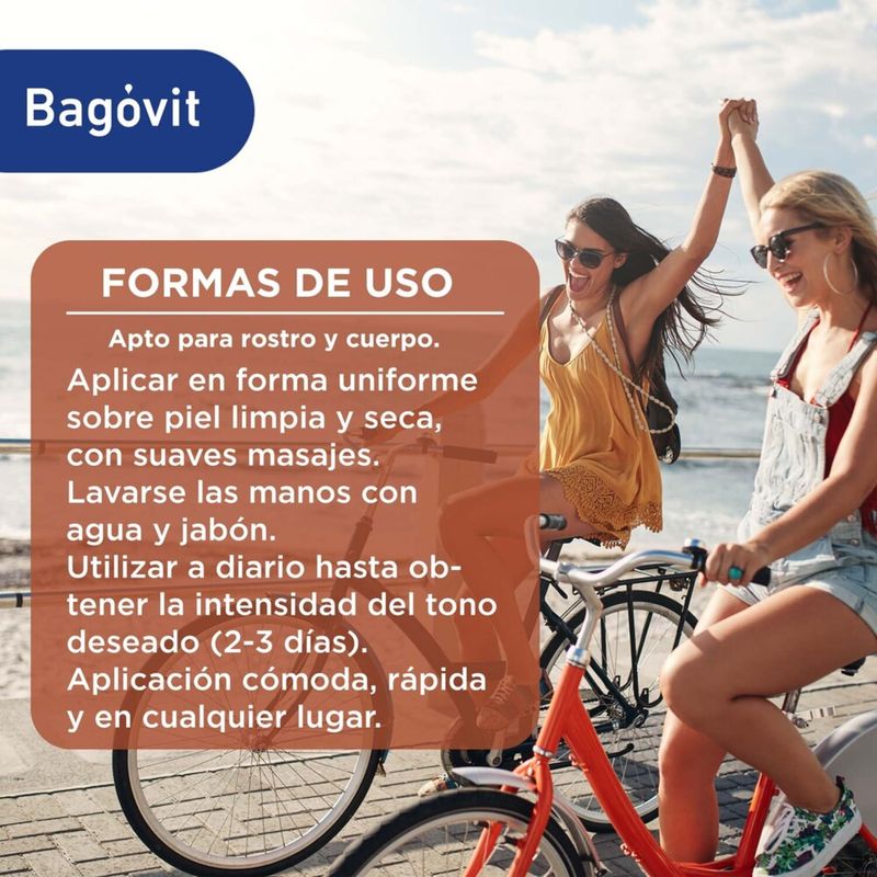 Spray Bagovit A Bronceado Progresivo Hipoalergénico contiene una fórmula enriquecida con Ácido Hialurónico y Vitaminas A y E, que hidratan y nutren tu piel mientras le brindan un tono de bronceado saludable en cualquier momento del año. En tan solo 3 días obtendrás el color ideal sin haber estado expuesta al sol. El Ácido Hialurónico actúa como una “esponja molecular” que retiene el agua brindándole a la piel hidratación continua. Además, estimula la circulación de agua entre las capas de la piel revitalizando y otorgándole suavidad y turgencia. Gracias a la Vitamina A, la piel incrementa la producción de colágeno e induce la síntesis de compuestos responsables de retener agua en la piel. Su acción reparadora restablece la elasticidad junto con la luminosidad y suavidad. Disminuye las arrugas producidas por el paso del tiempo y por el foto envejecimiento. Su fórmula enriquecida con Vitamina E también ayuda a proteger la membrana celular de los radicales libres y contribuye a su eliminación. Es una vitamina muy importante para la salud de la piel. Es hipoalergénico. BENEFICIOS - Hidrata y nutre tu piel mientras obtienes un tono bronceado saludable en cualquier momento del año. - En tan solo 3 días tendrás el color ideal sin haber estado expuesta al sol. - Ácido Hialurónico: permite fijar el agua a los tejidos y liberarla a las capas superiores. Actuando como una “esponja molecular” brindándole a la piel hidratación continua. Estimula la circulación de agua entre las capas de la piel revitalizando, otorgando suavidad y turgencia. - Vitamina A: la piel incrementa la producción de colágeno e induce la síntesis de compuestos responsables de retener agua en la piel. Su acción reparadora restablece la elasticidad junto con la luminosidad y suavidad. Disminuye las arrugas producidas por el paso del tiempo y por el foto envejecimiento. - Vitamina E: ayuda a proteger la membrana celular de los radicales libres y contribuye a su eliminación. Es una vitamina muy importante para la salud de la piel. Es hipoalergénico. MODO DE USO Aplicar en forma uniforme sobre piel limpia y seca, preferentemente exfoliada, con suaves masajes para facilitar su absorción. Lavarse las manos con agua y jabón inmediatamente luego de la aplicación. Utilizar a diario hasta obtener la intensidad del tono deseado (2-3 días). Luego aplicar de 2 a 3 veces por semana para mantener el color logrado. Apto para rostro y cuerpo.