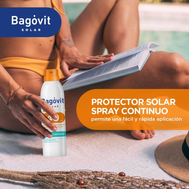 Bagóvit Solar en Spray Continuo con Factor de Protección Solar 40 es ideal para pieles muy sensibles a las quemaduras solares. Su fórmula con Vitamina E y Aloe Vera es especial para proteger áreas delicadas del cuerpo y evitar el fotoenvejecimiento prematuro de la piel. El sistema de spray continuo permite una fácil y rápida aplicación. Gracias a su textura ultraliviana se esparce y se absorbe de manera inmediata sobre la piel. Además, es amigable con el medio ambiente, ya que su envase es inofensivo para la capa de ozono. Es hipoalergénico y resistente al agua.