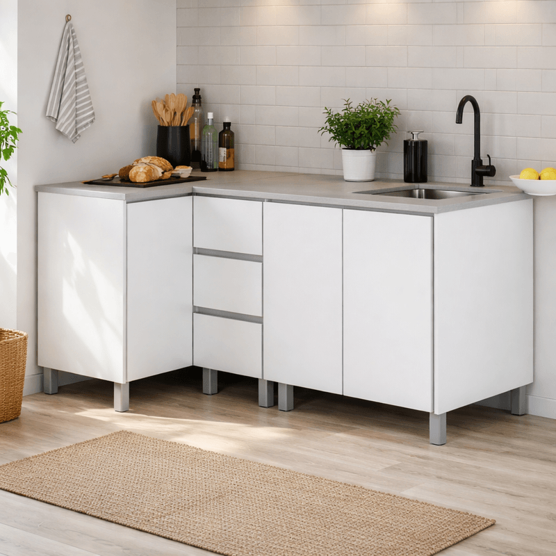 Bajo mesada esquinero de 0,98 m + Bajo mesada de 0.60 m + Bajo mesada cajonera de 0.40 m