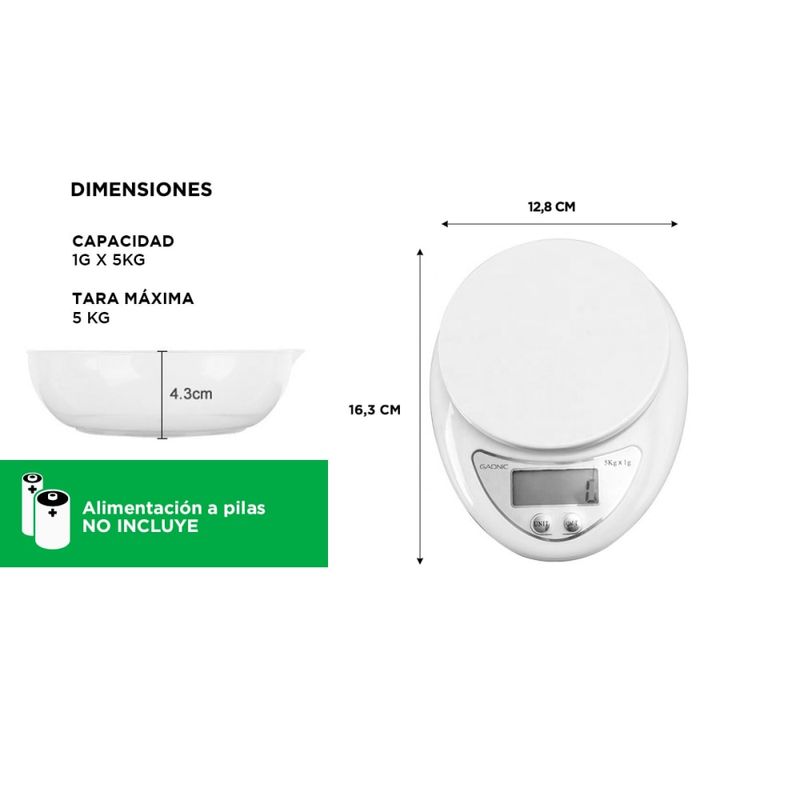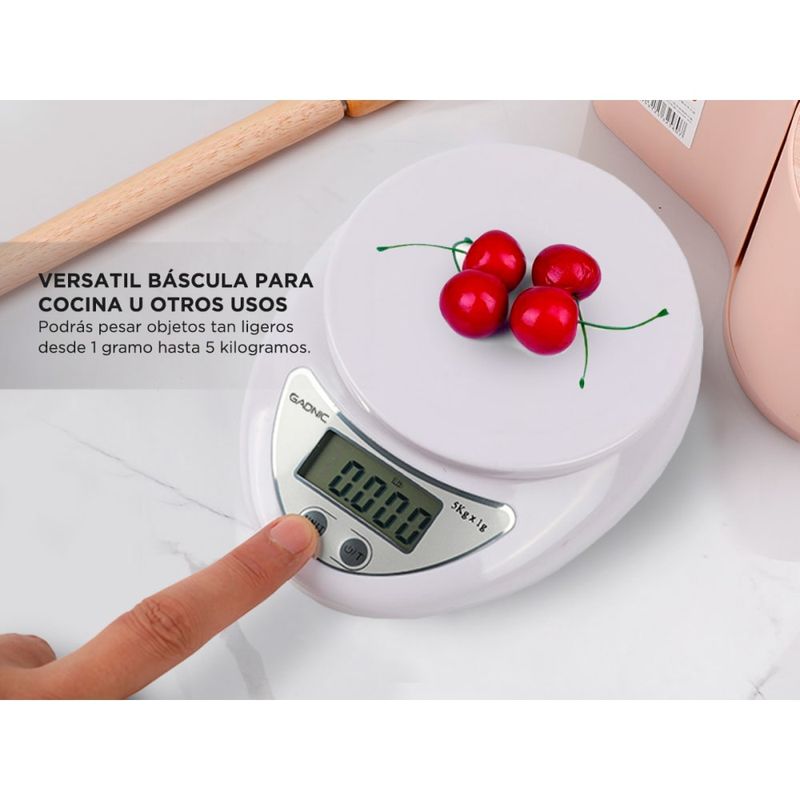 Versatil báscula para cocina u otros usos, fácil manejo; podrás pesar objetos tan ligeros desde 1 gramo hasta 5 kilogramos.