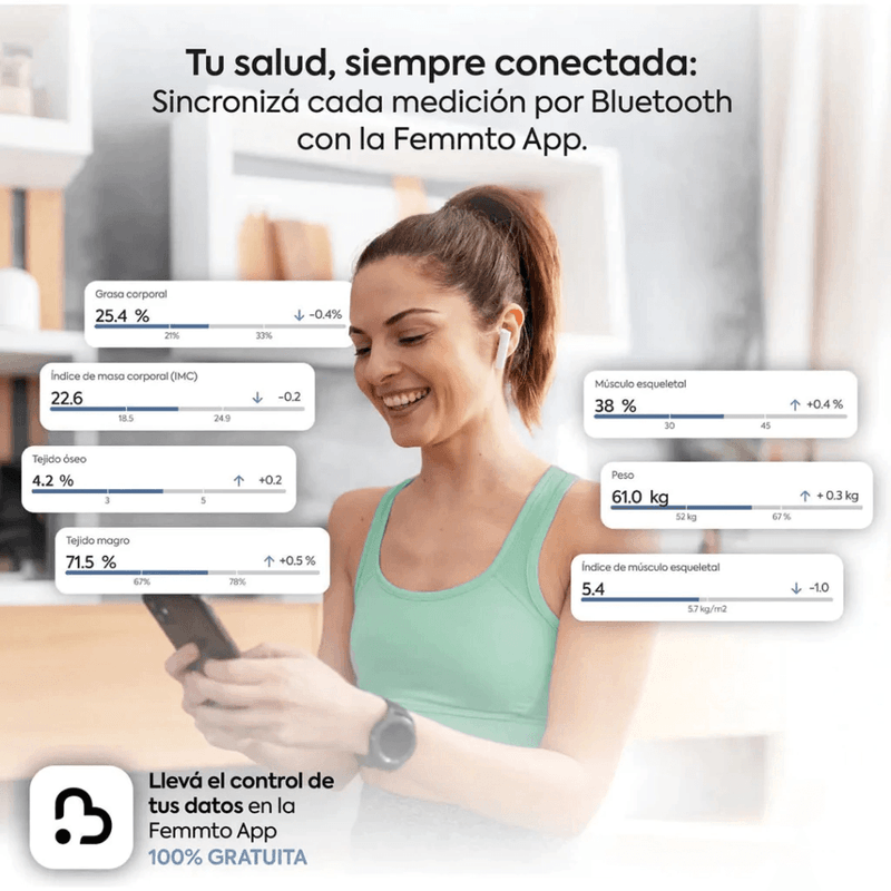 • Conectividad inalámbrica: Conéctate con tu smartphone a través de Bluetooth mediante la aplicación FEMMTO (compatible con iOS y Android).