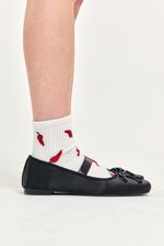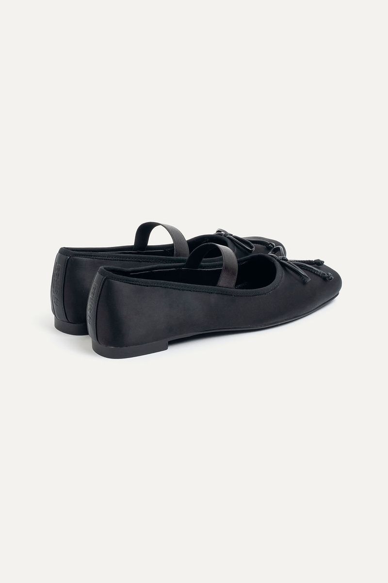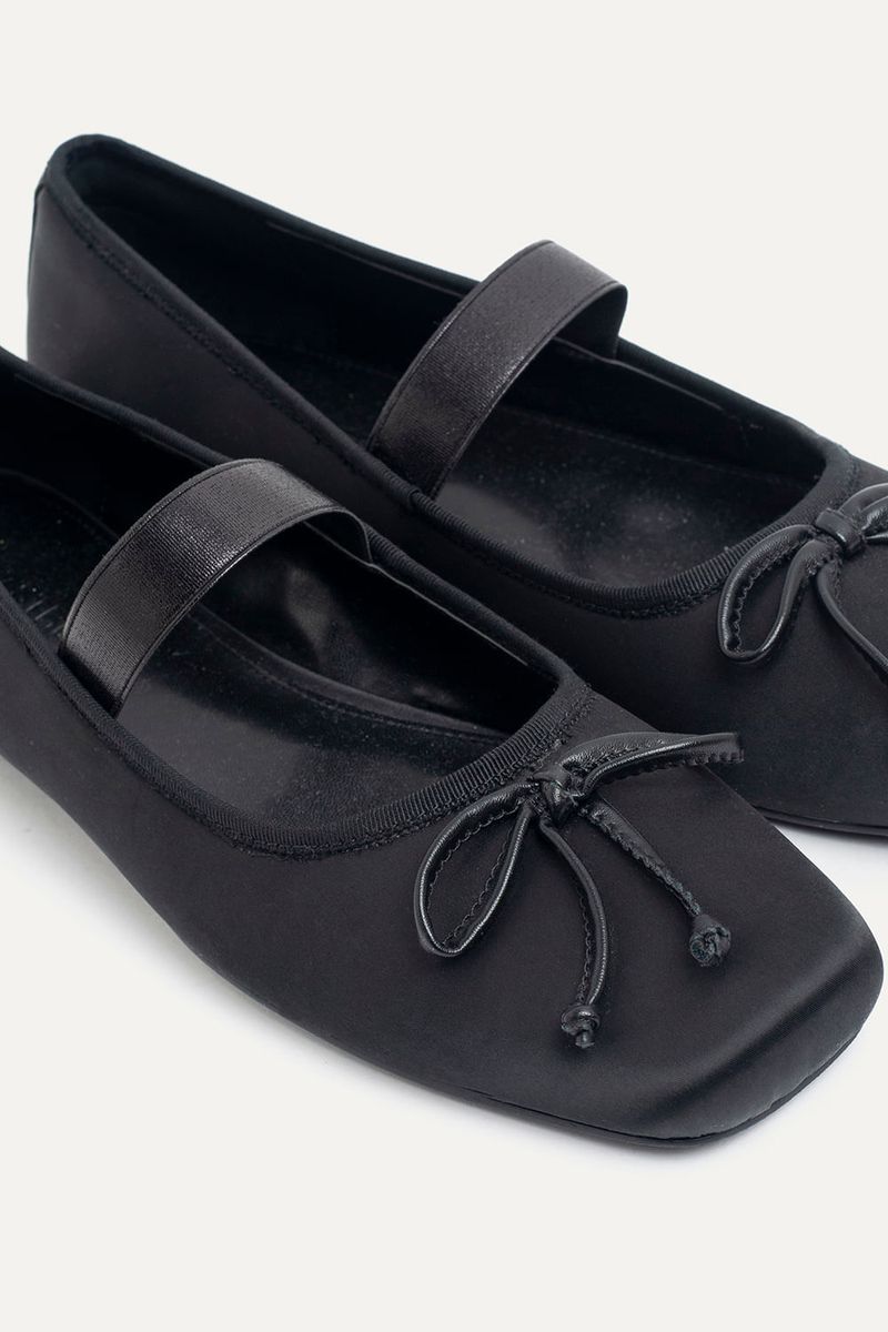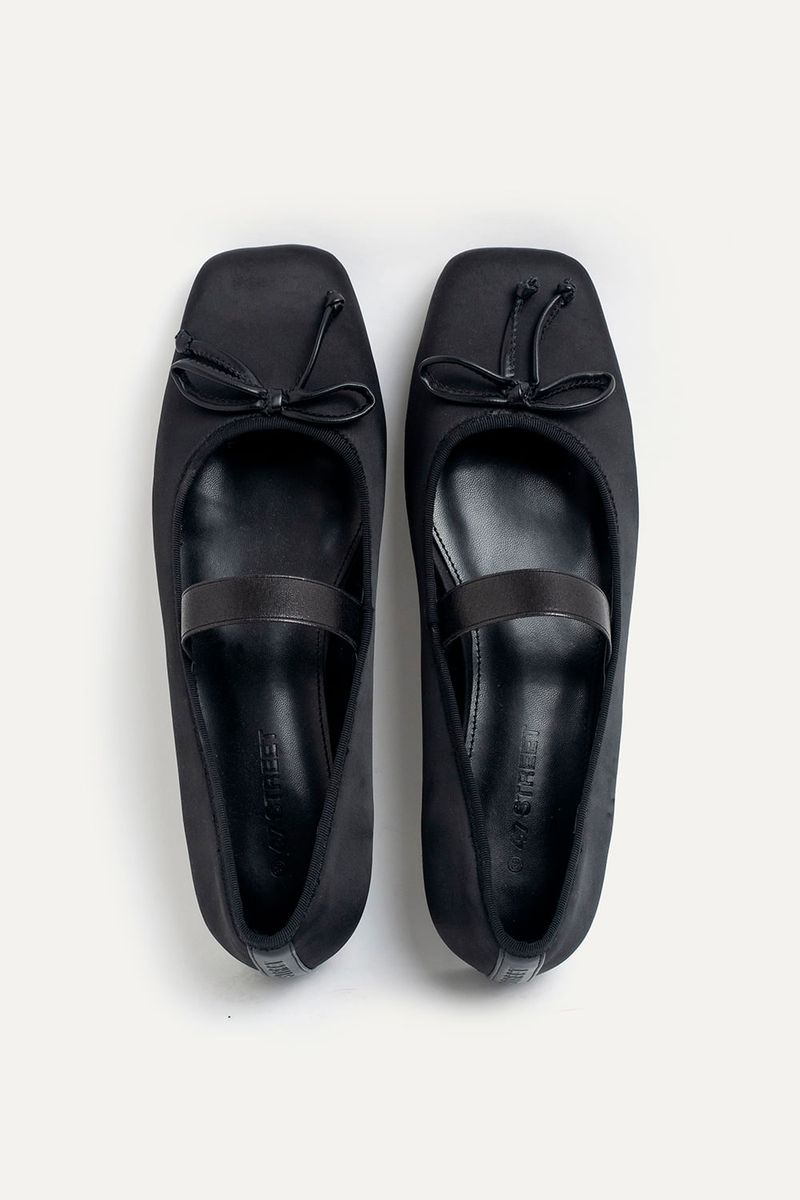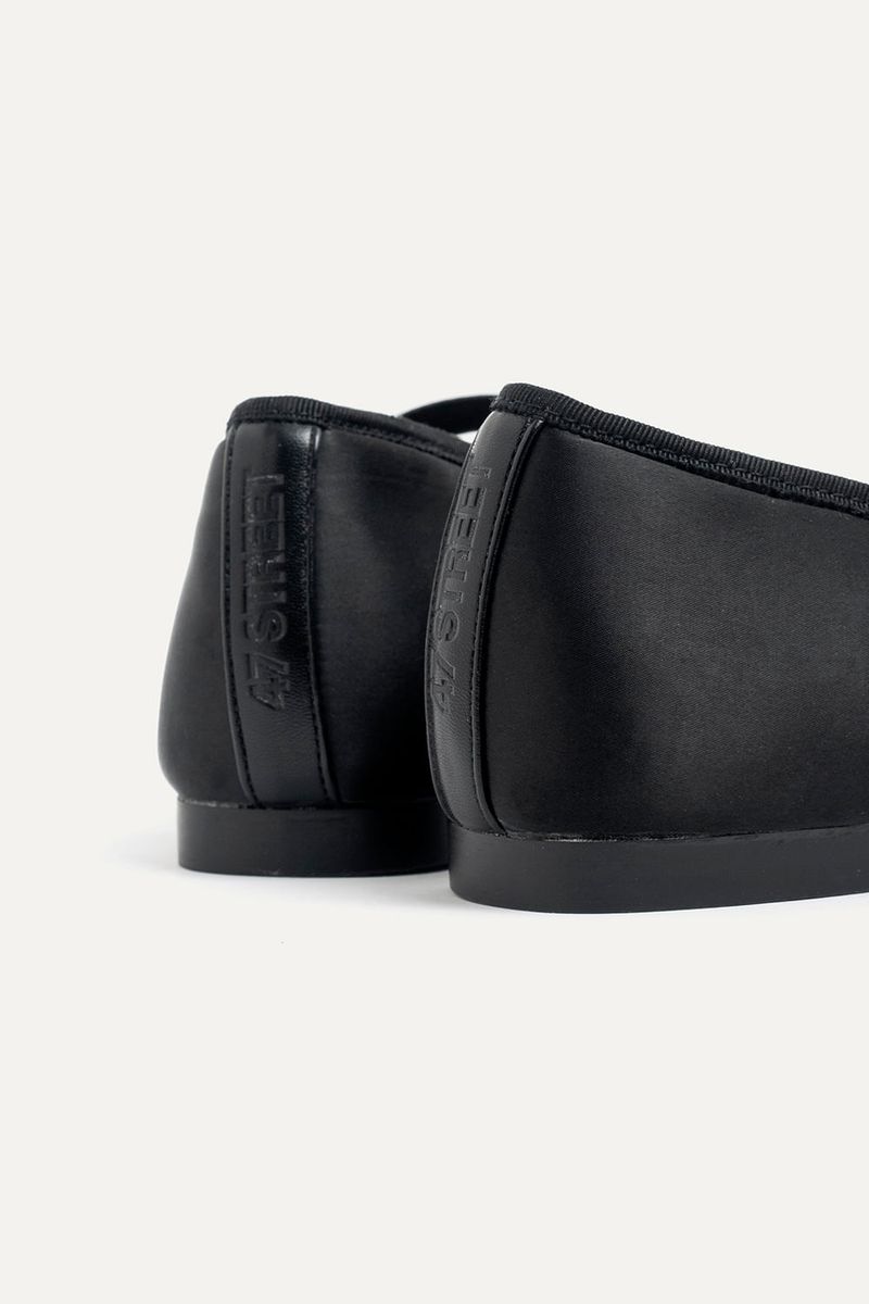 Ballerina de satén negra con elástico superior y moño en símil cuero. Un diseño clásico que suma delicadeza a cualquier look, perfecta para combinar con vestidos ligeros, jeans rectos o faldas midi.