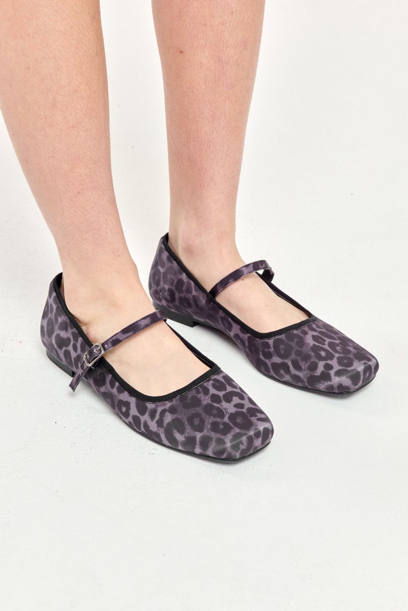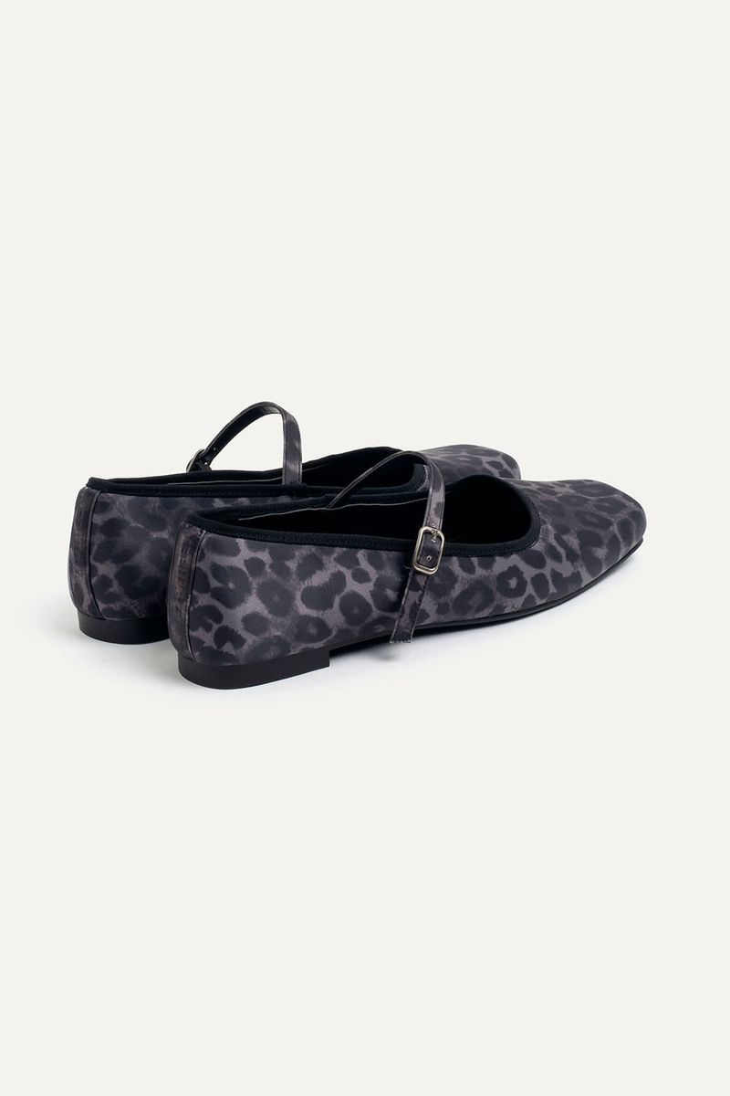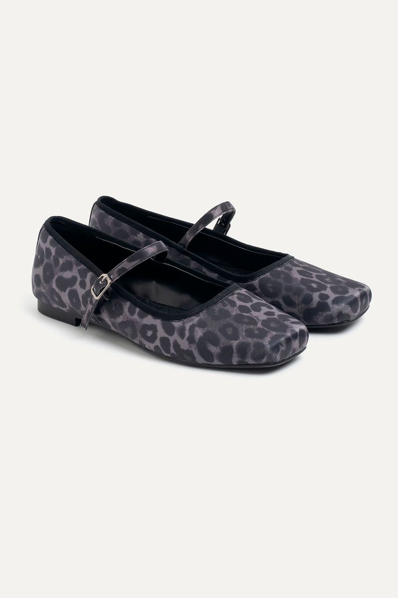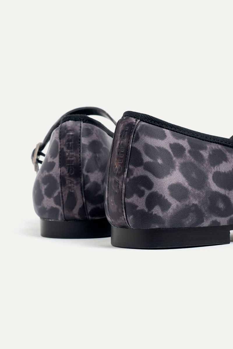 Ballerina de satén con estampado de leopardo, ideal para levantar cualquier look. Tiene hebilla metálica regulable y calce cómodo, perfecta para llevar con jeans anchos, pantalones cargo o vestidos lisos.
