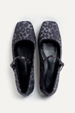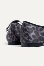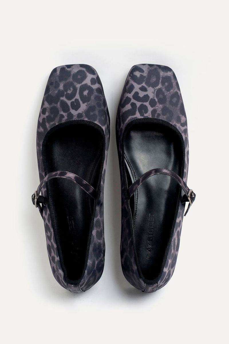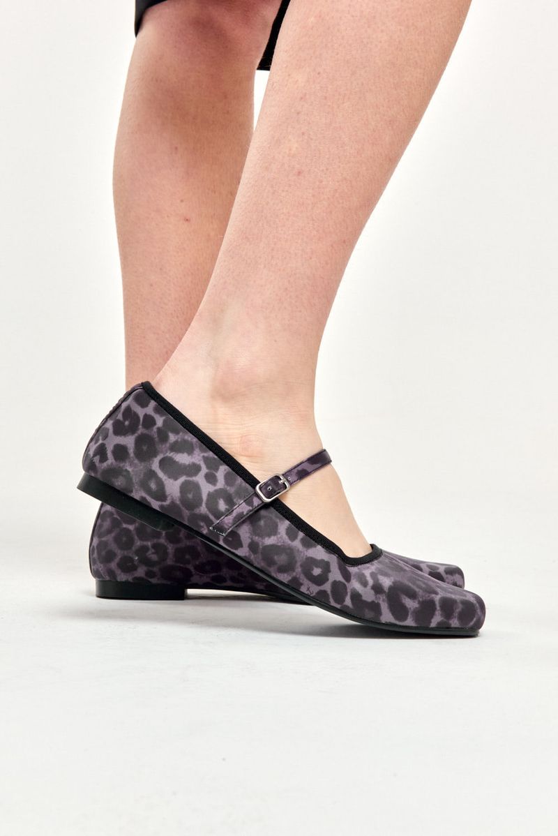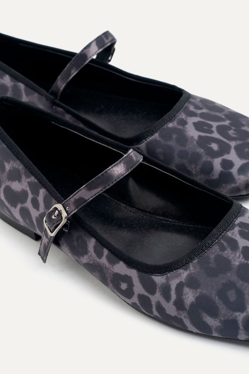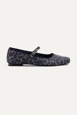 Ballerina de satén con estampado de leopardo, ideal para levantar cualquier look. Tiene hebilla metálica regulable y calce cómodo, perfecta para llevar con jeans anchos, pantalones cargo o vestidos lisos.