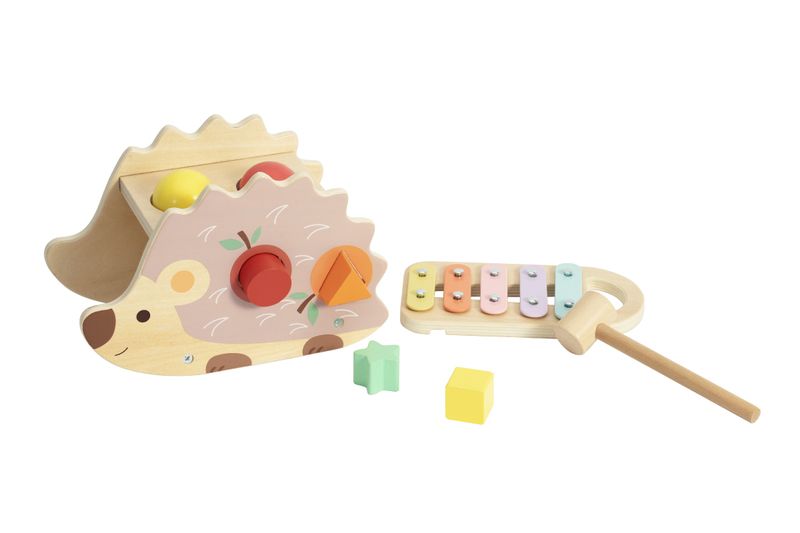 Erizo de madera con figuras de encastre y xilofón