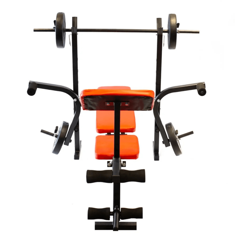 Lleva tu entrenamiento al siguiente nivel con este banco reforzado que incluye barra, discos y mancuernas. Con respaldo ajustable, mariposa, dorsalera y banco Scott intercambiables, es la estación ideal para trabajar todo tu cuerpo desde casa.