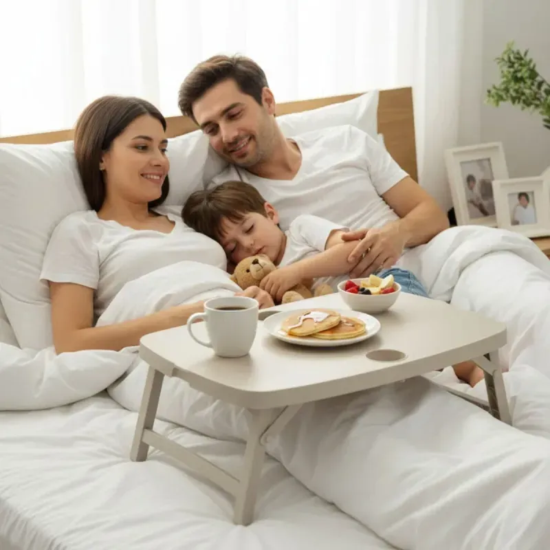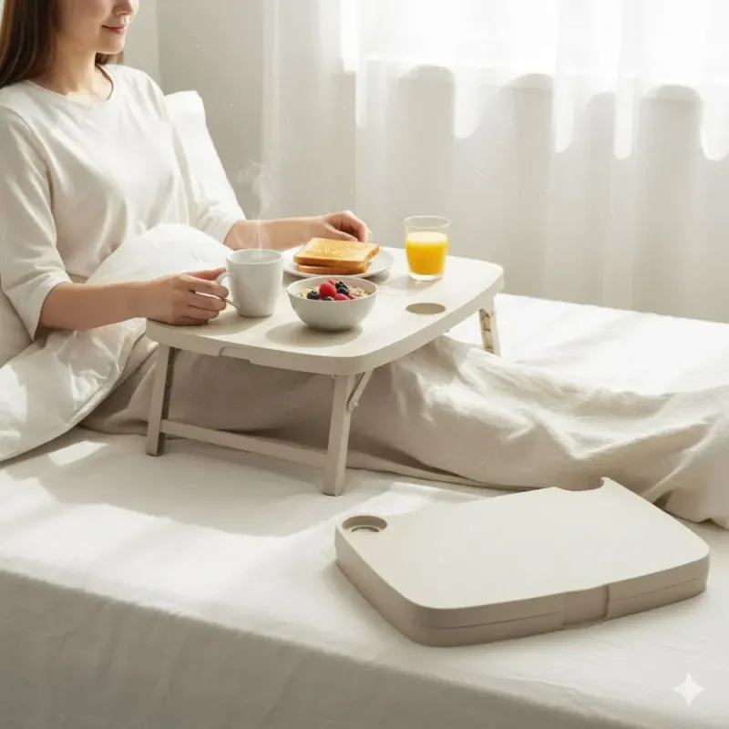 Práctica y Compacta: Diseñada para ser ultra portátil, esta mesa plegable es tu compañera perfecta para desayunar en la cama, trabajar desde el sofá, hacer un picnic improvisado o incluso usarla para cuando estas en la piscina.