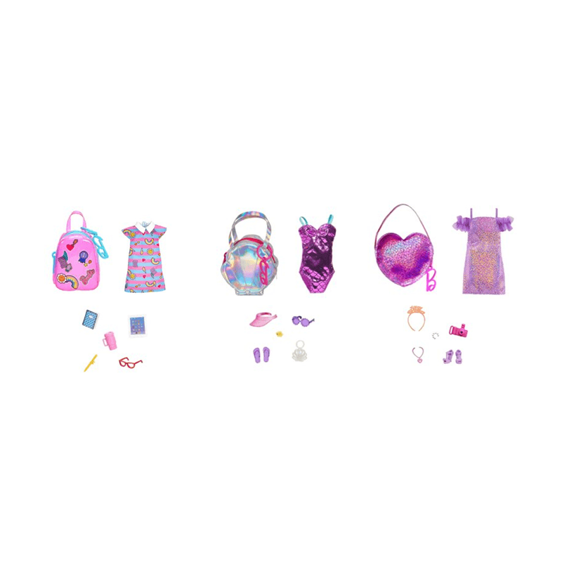 Estos paquetes de accesorios de Barbie incluyen un bolso hermoso y llamativo que viene con cinco piezas narrativas temáticas.