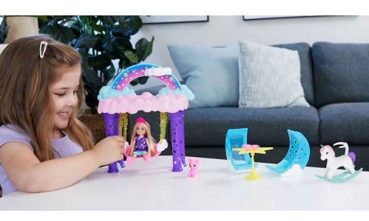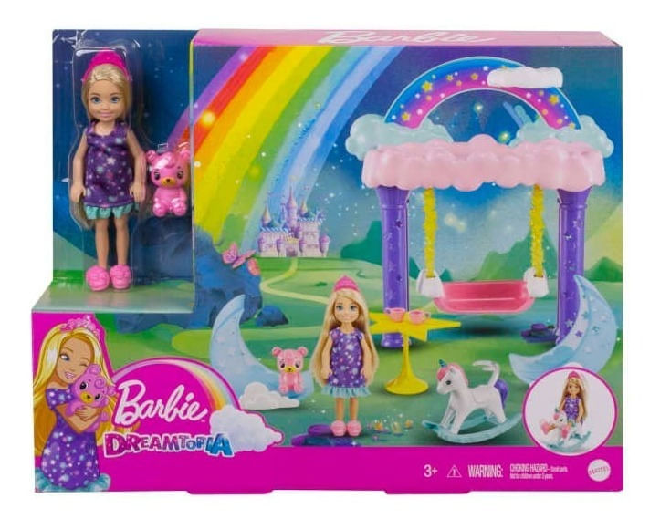 Inspira la creación de cuentos de hadas con los sets de juego Chelsea™ de Barbie™ Dreamtopia. El fantástico set de pijamada de la muñeca Chelsea™ viene con diseños coloridos y detalles que permiten que las historias vayan a donde sea que las lleven las mentes de las pequeñas. Cuando llega la hora de jugar, la muñeca Chelsea™ y su osito de peluche pueden subirse al columpio inspirado en las nubes y turnarse en el unicornio que se balancea. Y a la hora de dormir, los amigos pueden beber chocolate caliente sentados en las sillas de luna antes de subir a la cama alta en las nubes. Es fácil representar e imaginar los sueños con este set de juego de Chelsea™ con temática de hadas, porque, cuando entras a Dreamtopia, despiertas en un mundo donde los sueños se hacen realidad. La muñeca no se puede mantener de pie por sí sola. Los colores y las decoraciones pueden variar.