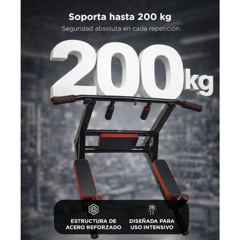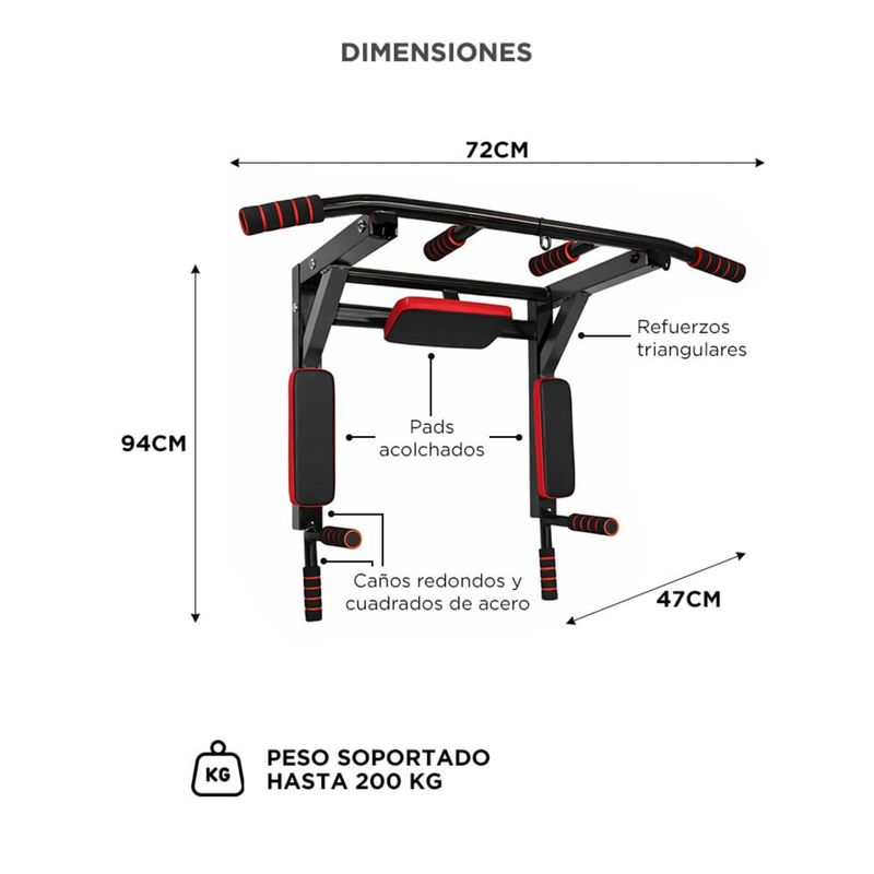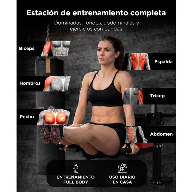 Funciona como estación multifunción para dominadas, fondos, abdominales y ejercicios con bandas.