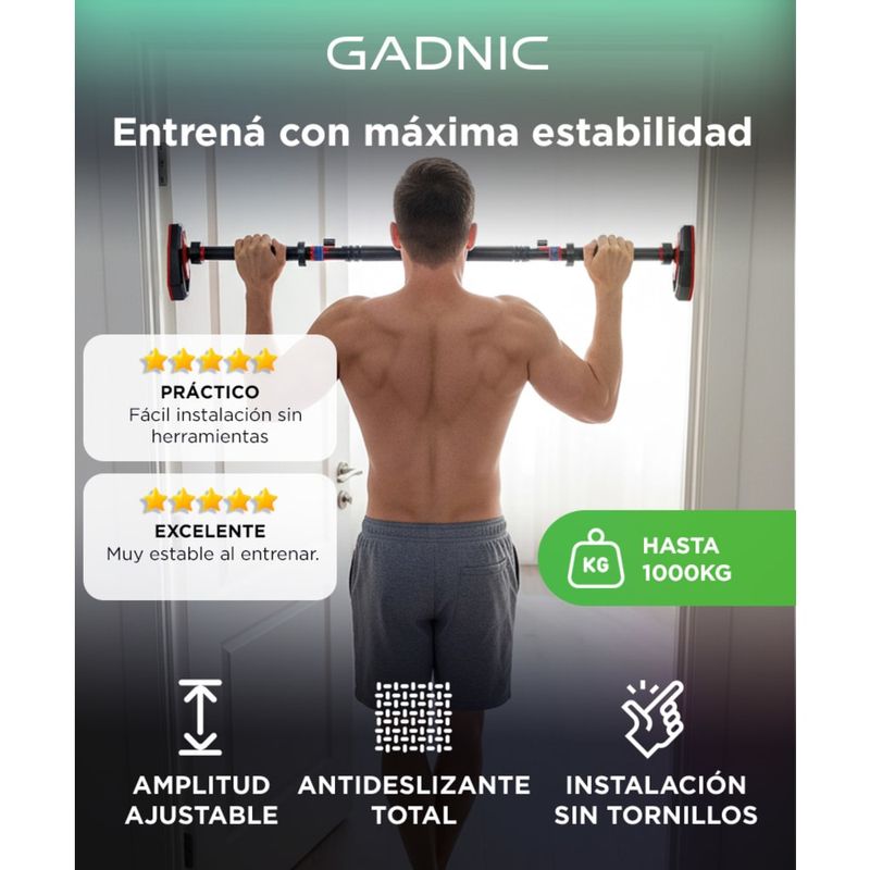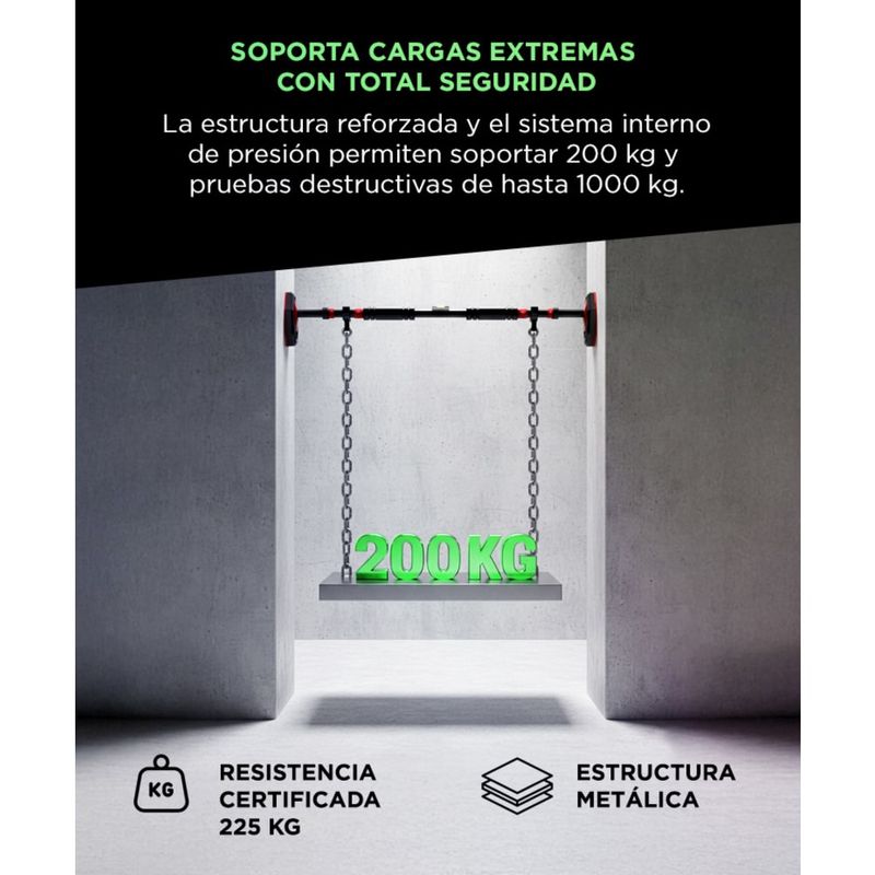 La barra para dominadas de Gadnic está diseñada para soportar cargas reales de hasta 225 kg, con pruebas destructivas de 1000 kg que garantizan su durabilidad. Su estructura reforzada permite entrenamientos intensos sin movimientos indeseados, incluso en superficies lisas.