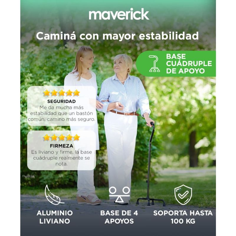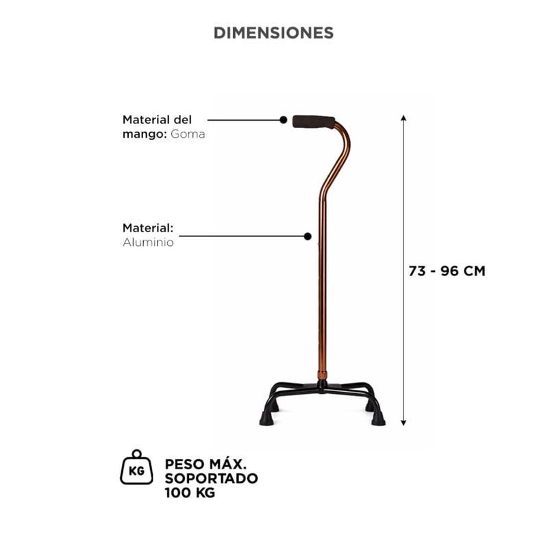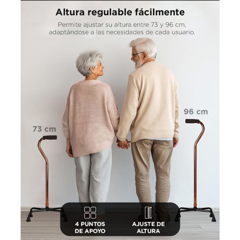 Diseño con 4 puntos de apoyo que brinda mayor equilibrio y estabilidad que un bastón tradicional, ideal para usuarios que necesitan más seguridad.