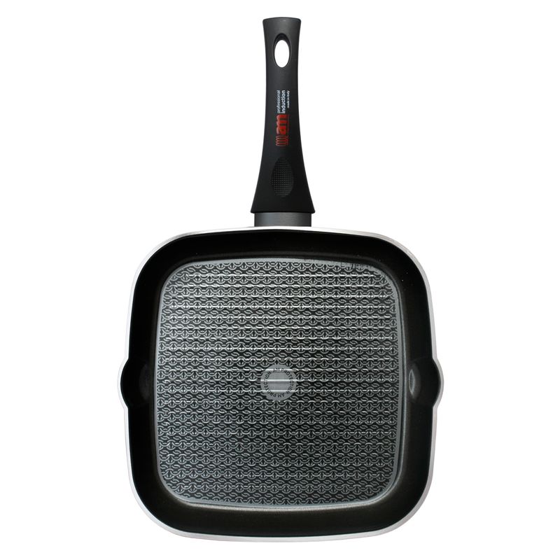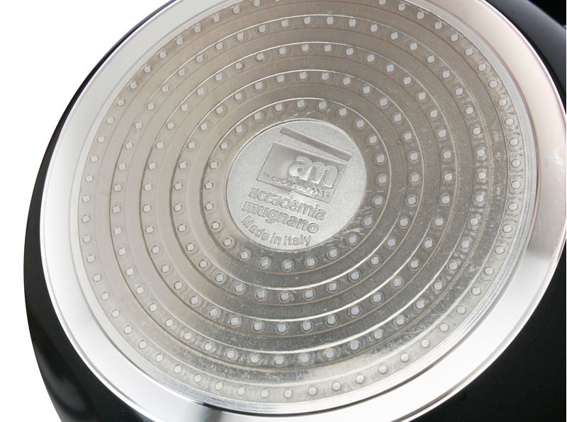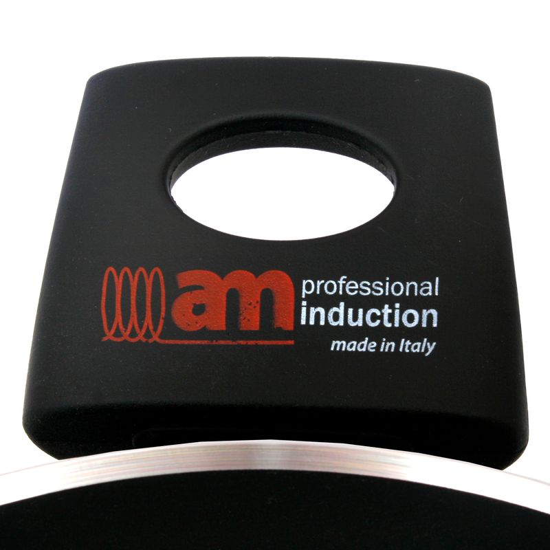 Fondo de inducción profesional AM, equipado con una placa especial de acero manético estudiada específicamente para placas de inducción y utilizable también en todas las demás superficies de cocción: vitrocerámicas, eléctricas, a gas, halógenas y radiantes.