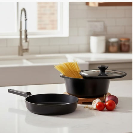 Este set de 2 piezas de aluminio fundido te permite cocinar con eficiencia y facilidad. Su recubrimiento antiadherente sin PFOA evita que los alimentos se peguen y facilita la limpieza.