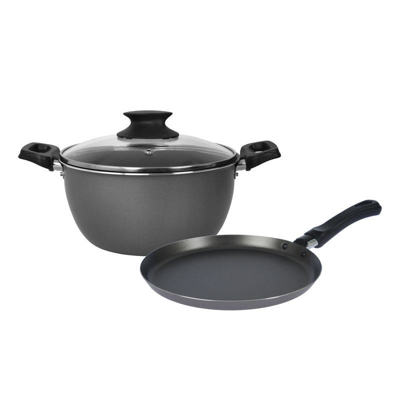 Batería de cocina de Aluminio recubierto de laca resistente a alta temperatura en su parte externa y Antiadherente en su interior.