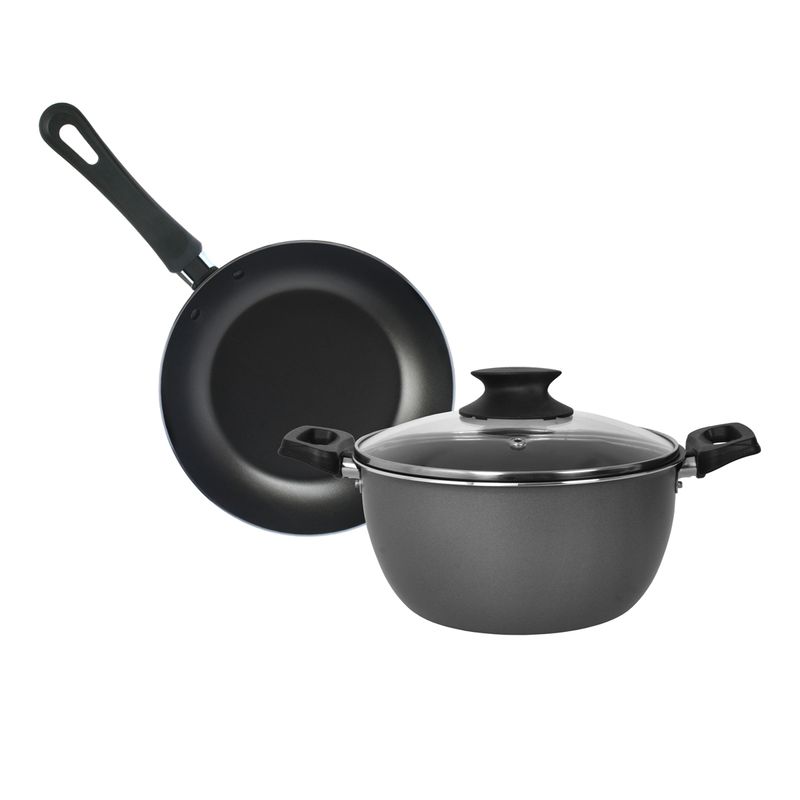 Batería de cocina de Aluminio recubierto de laca resistente a alta temperatura en su parte externa y Antiadherente en su interior.