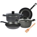 Batería de cocina de Aluminio recubierto de laca resistente a alta temperatura en su parte externa y Antiadherente en su interior.