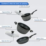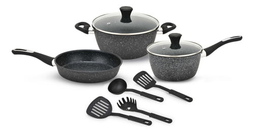 La batería Kanji Gourmet ofrece calidad, durabilidad y diseño moderno para el uso diario. Fabricada en acero al carbono con un atractivo acabado tipo mármol negro, garantiza una cocción pareja y eficiente. Su revestimiento antiadherente evita que los alimentos se adhieran y facilita la limpieza.