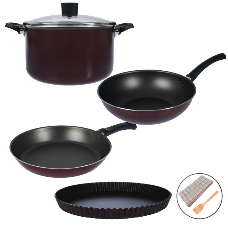 Batería de cocina de Aluminio recubierto de laca resistente a alta temperatura en su parte externa y Antiadherente en su interior.