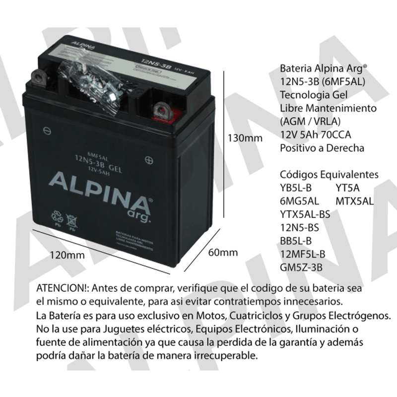 Bateria Moto Gel Libre Mantenimiento 12N5-3B / 6Mf5Al Alpina