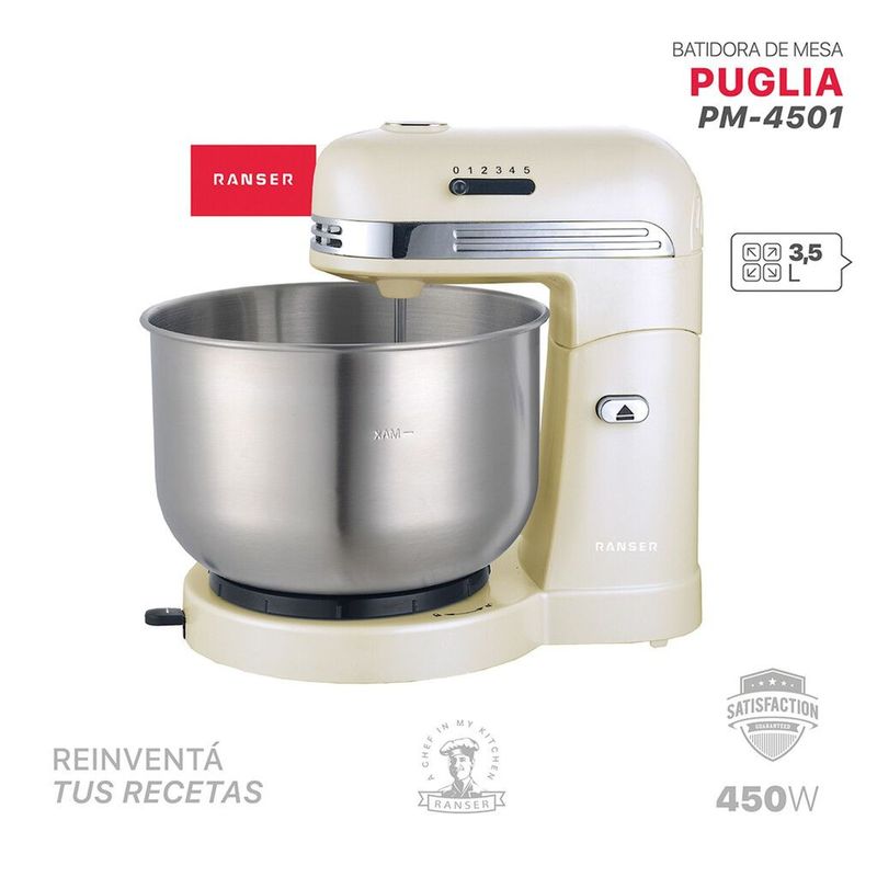 La Batidora Planetaria Ranser Puglia PM-4501 combina potencia, diseño y practicidad para acompañarte en tus preparaciones de repostería y cocina diaria. Con un motor de 450 W y 5 velocidades, se adapta a todo tipo de mezclas, desde cremas suaves hasta masas más densas.