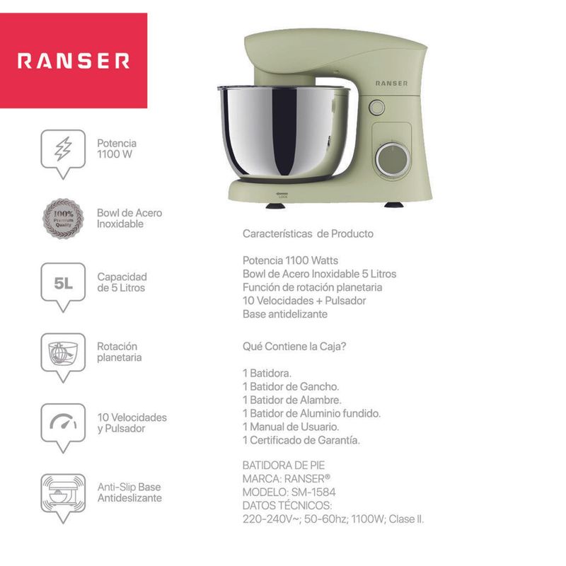 La batidora planetaria Ranser Cuomo SM-1584 combina potencia, estabilidad y capacidad para adaptarse a una amplia variedad de preparaciones domésticas. Equipada con un motor de 1100 W y un bowl de acero inoxidable de 5 litros, permite trabajar grandes cantidades de mezcla con resultados homogéneos. Su sistema de rotación planetaria optimiza el contacto con todos los ingredientes, logrando texturas uniformes en menos tiempo.