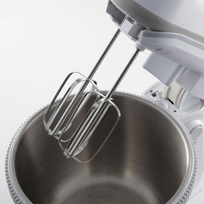 La batidora combina la posibilidad de trabajar con líquidos y también ingredientes pesados como masas gracias a sus accesorios de batidores y ganchos amasadores hechos en acero inoxidable que además son aptos para lavavajillas.