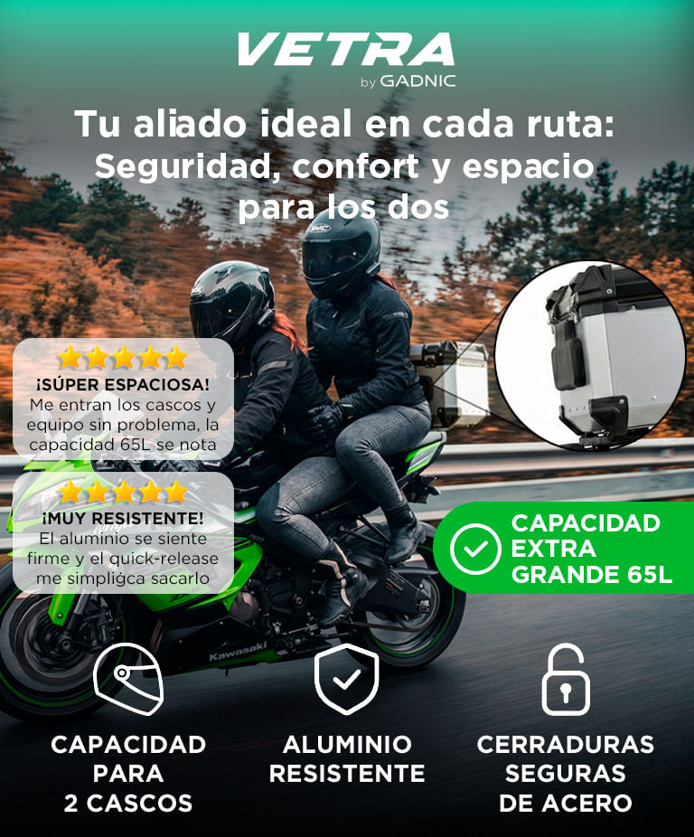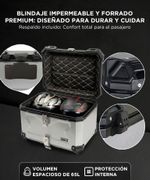 El baúl porta casco Vetra by Gadnic 65L permite transportar cascos y equipaje con comodidad. Su volumen amplio lo vuelve ideal para trayectos urbanos y viajes largos.