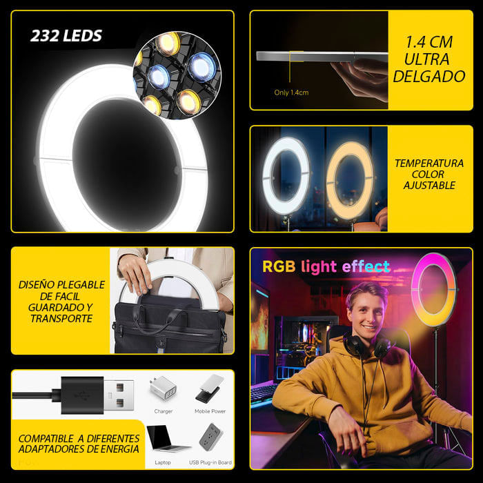 Anillo de luz RGB plegable de 30cm con soporte ajustable.