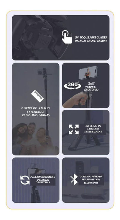 Control remoto Bluetooth desmontable: equipado con un control remoto Bluetooth desmontable, este trípode para teléfono le permite tomar fotografías cómodamente desde la distancia; perfecto para fotos grupales, tomas en solitario y capturar varias escenas sin esfuerzo