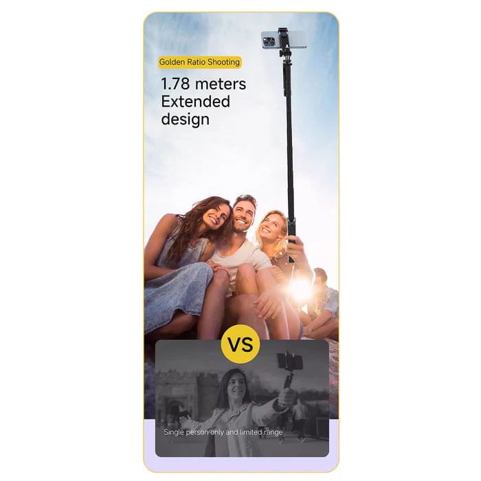 Longitud máxima de extensión: 1,74 metros.Este trípode selfie compacto para iPhone cuenta con 7 secciones, 6 de ellas ajustables, todas fabricadas en ABS y aleación de aluminio, con una longitud máxima de extensión de hasta 1,74 metros. Permite a los amantes de los viajes o los deportes al aire libre capturar hermosos paisajes en cualquier momento y lugar. Es una herramienta esencial para los amantes de las actividades al aire libre. El trípode para teléfono es perfecto para tomar fotos grupales, vídeos, transmisiones en vivo, etc.