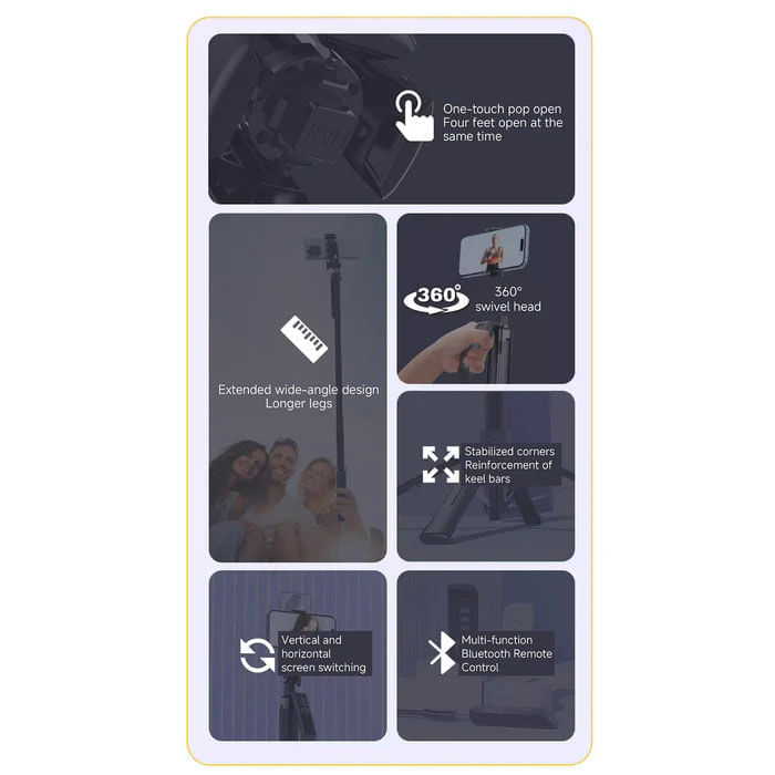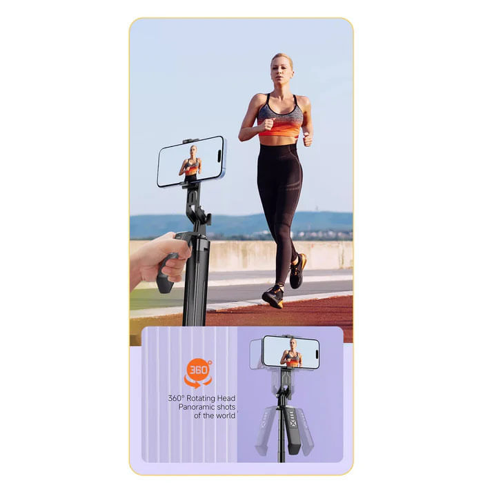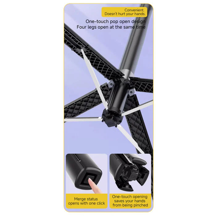 Diseño estable de cuatro patas, experiencia de usuario mejorada: Fabricado con aleación de aluminio de primera calidad, garantiza durabilidad y estabilidad. Equipado con patas de trípode alargadas y una estructura tipo paraguas, además de un soporte mejorado de cuatro puntos, ABS y varillas telescópicas de aleación de aluminio, el trípode para iPhone garantiza una estabilidad excepcional incluso durante la grabación de video. Ideal para usuarios que necesitan un soporte para celular para grabar, un palo selfie con control remoto o un trípode para crear contenido en el iPhone 16 Pro Max.