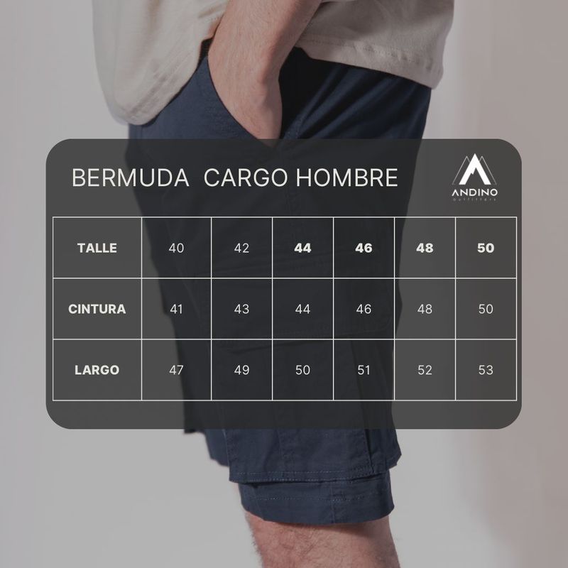 Bermuda liviana de gabardina estilo cargo de secado rápido, ideal para aquellos que disfrutan de la comodidad y el estilo en su día a día. Con amplios bolsillos en los laterales y en la parte trasera, esta prenda es perfecta tanto para el uso urbano como para actividades de trekking.
