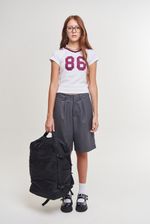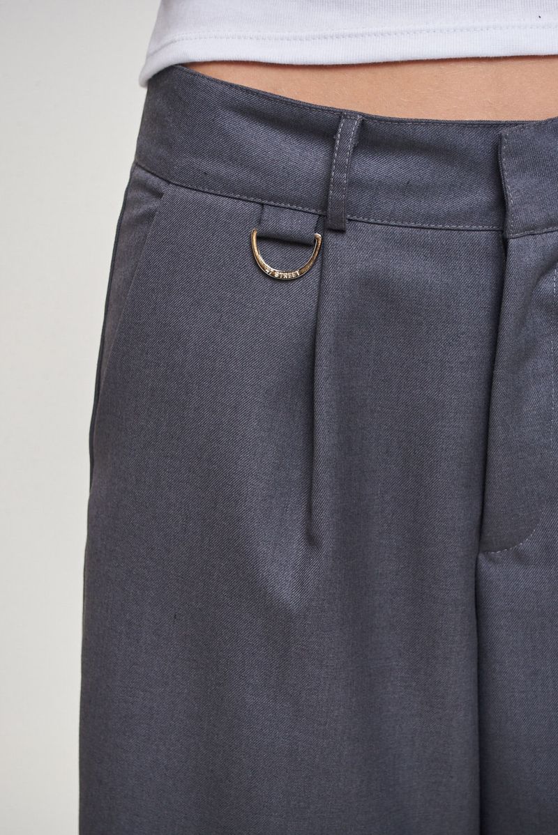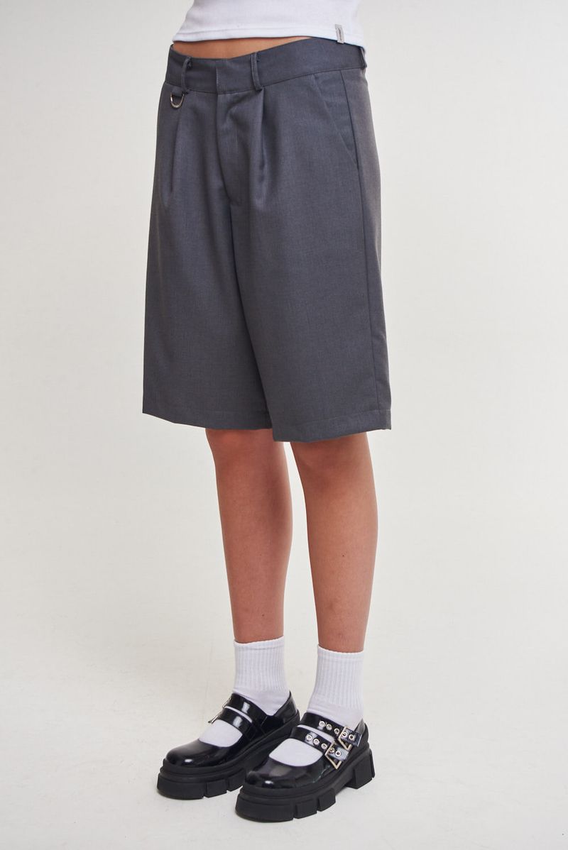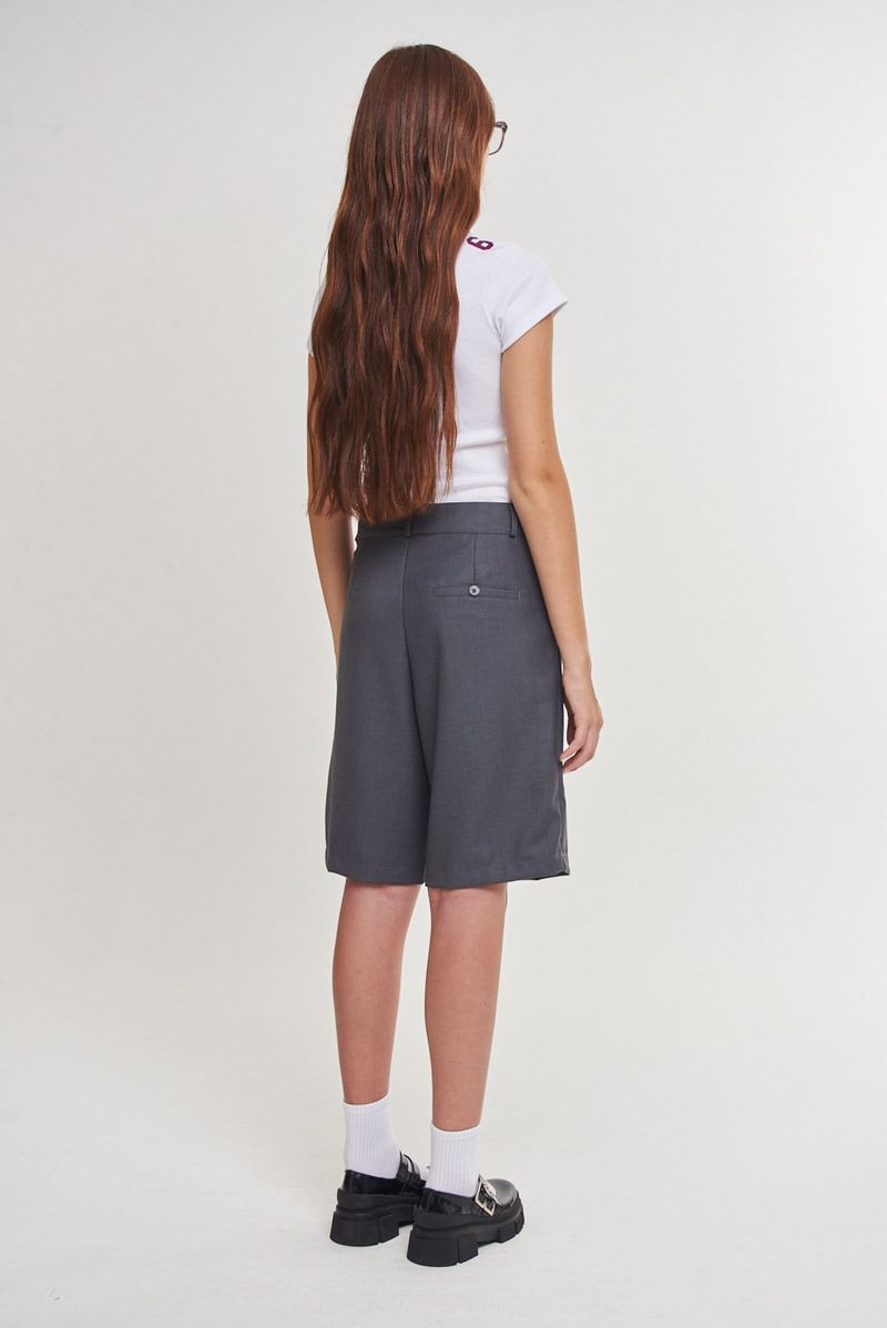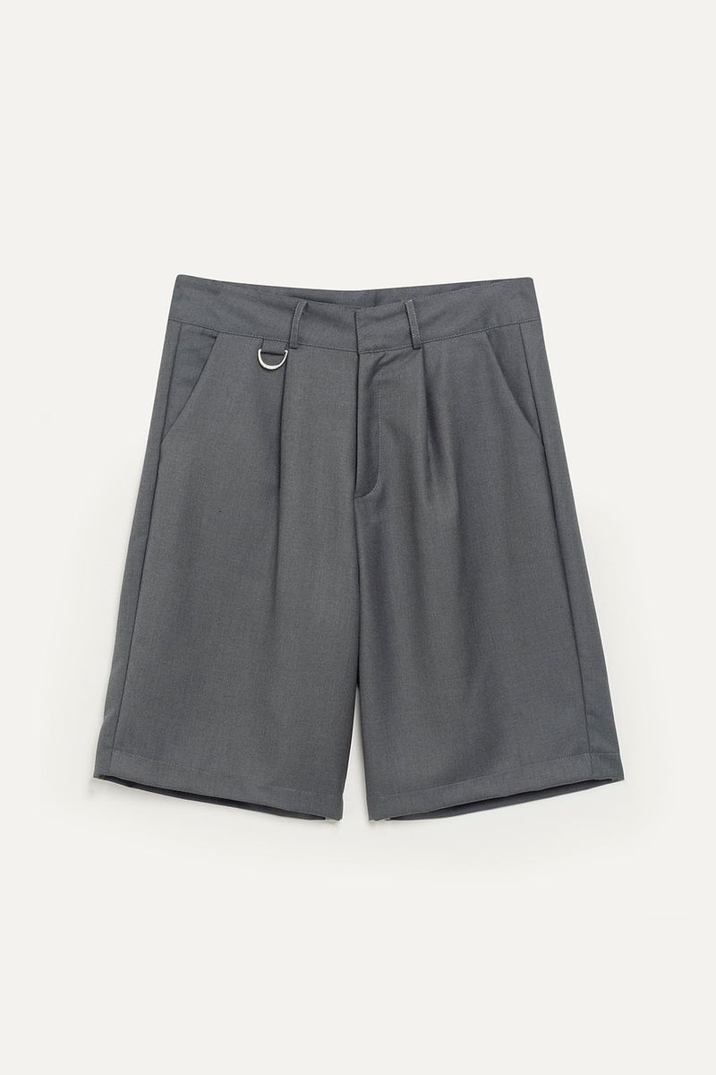 Bermuda sastrera lisa de calce relajado, con pinza delantera y detalle de medialuna metálica personalizada con logo institucional de níquel.