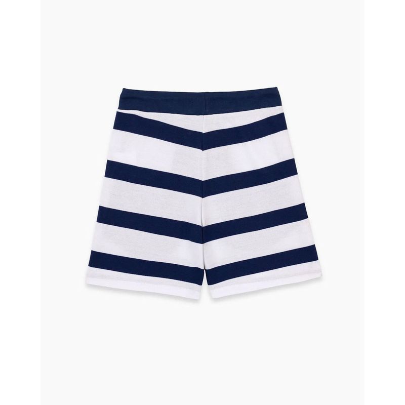 Bermuda confeccionada en rustico rayado con detalles en rustico liso. Posee bolsillos con cierres a contra tono. Cintura con elástico interno y cordón. Calce relajado.