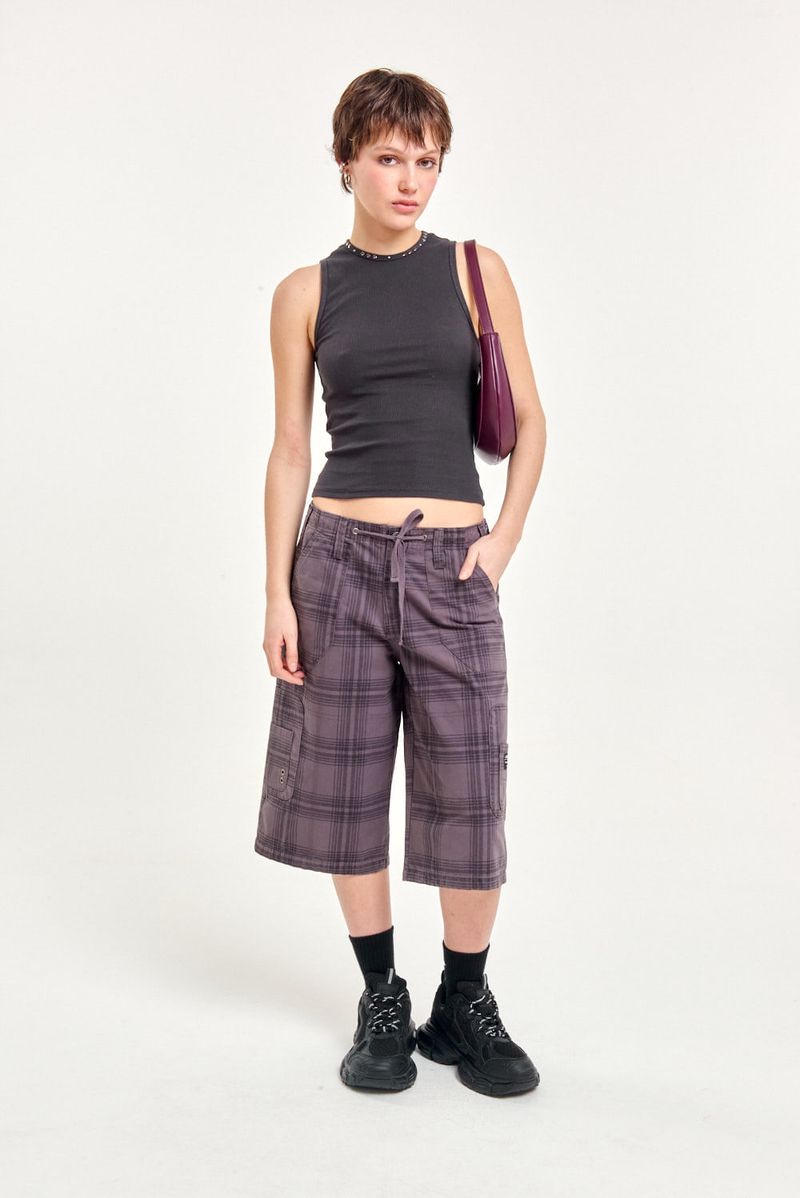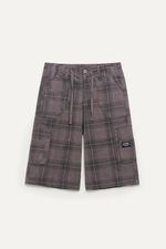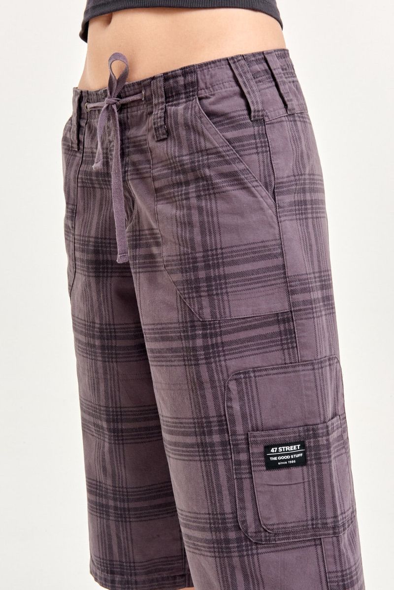 Bermuda de gabardina estampada con costuras visibles. Presenta recortes en tela base, bolsillos plaqué delanteros y traseros, además de detalles de ojales y bolsillos laterales. Cintura con presillas, botón central y cordón para ajuste. Incluye detalles de la marca. Ideal para un look cómodo con musculosas y sandalias o zapatillas ligeras.