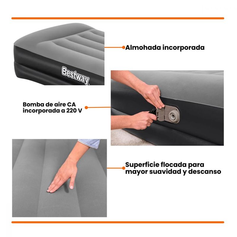 Incorporando una bomba de aire eléctrica de 220V, facilita el inflado y desinflado en cuestión de minutos, eliminando cualquier esfuerzo adicional.