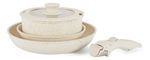 Descubre la batería de cocina antiadherente con sistema de inducción, ideal para optimizar tu espacio. Incluye cacerola de Ø 18 cm con tapa, sartén de Ø 20 cm, sartén de Ø 26 cm y mango extraíble. Sus cuerpos son aptos para horno, y las tapas de vidrio cuentan con salida de vapor. Fabricada con aluminio reforzado y 3 capas antiadherentes, garantiza durabilidad y una cocción perfecta