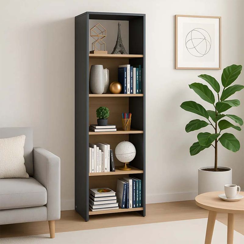 La biblioteca de la línea Niza es una amalgama perfecta de funcionalidad y estilo. Ofrece un generoso espacio de almacenamiento distribuido en cinco estantes, de los cuales dos están diseñados específicamente para libros, incorporando fondos que evitan que estos se caigan. Los restantes estantes se presentan como opciones ideales para almacenar diversos objetos y también para fines decorativos.