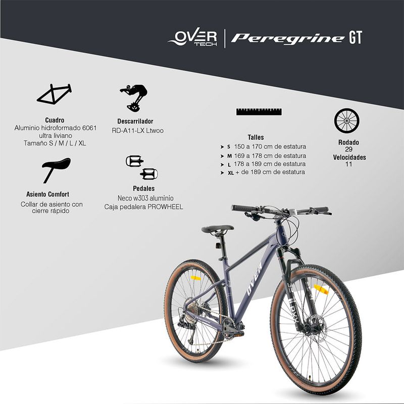 Bicicleta Mtb Overtech Peregrine GT R29 Aluminio 11 Velocidades, Freno Hidraulico, Suspensión de Aire con Bloqueo REMOTO