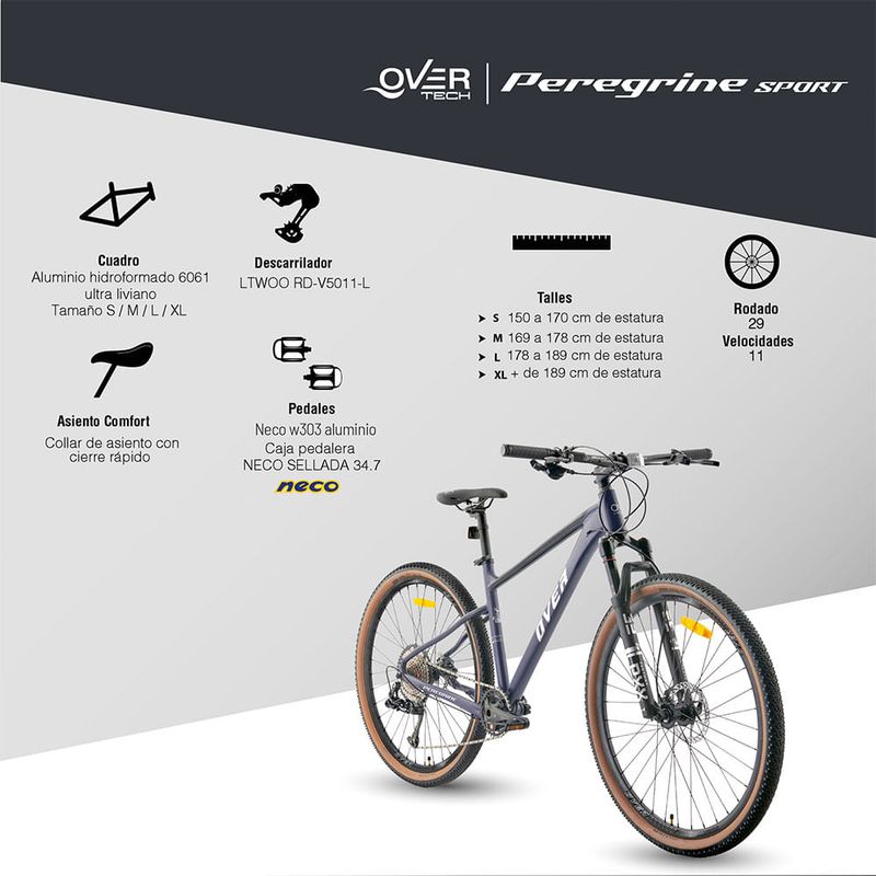 "Bicicleta Mtb Overtech Peregrine Sport R29 Aluminio, Monoplato, 11 Velocidades, Freno Hidraulico, Suspensión de Aire con Bloqueo