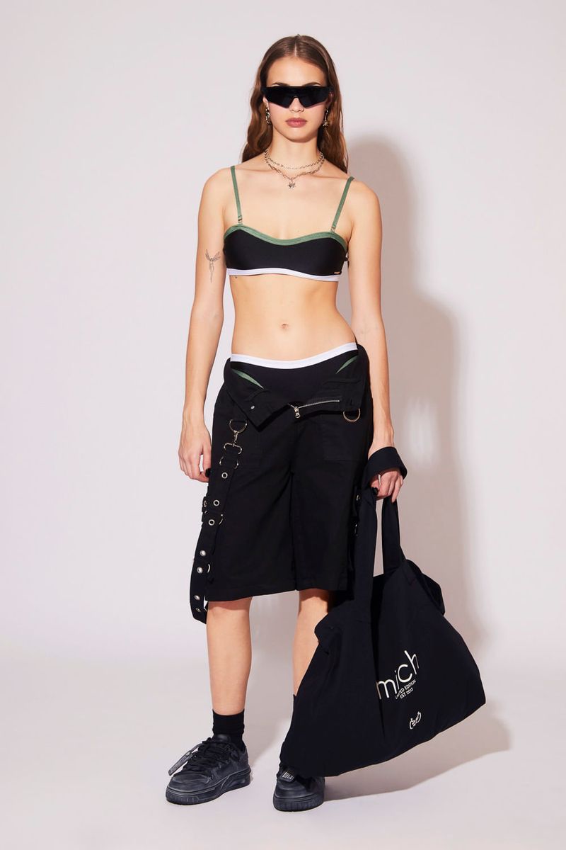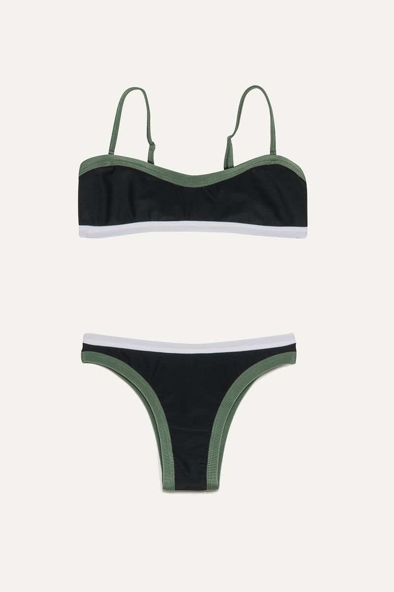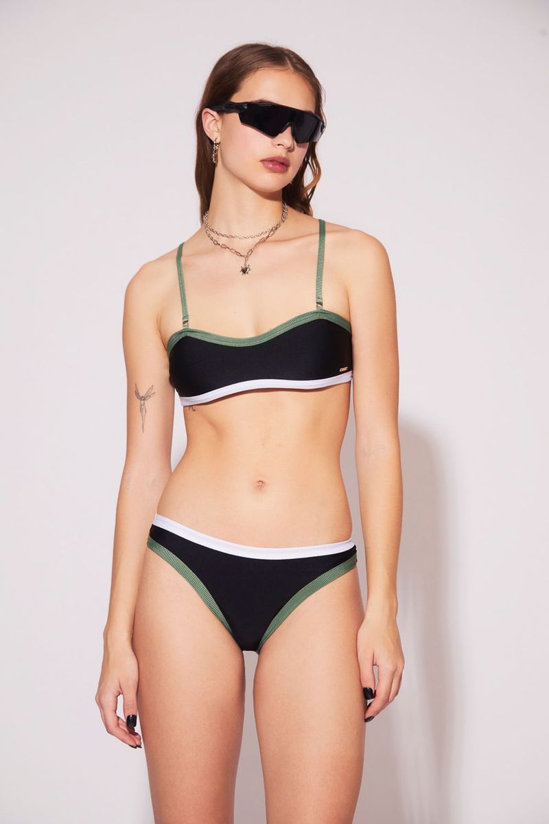 Bikini compuesta por un top con escote corazon, con vivos de morley a contratono, con breteles desmontables y acceso con un gancho metalico en la espalda. Vedetina entera con vivos en morley a contratono.