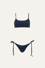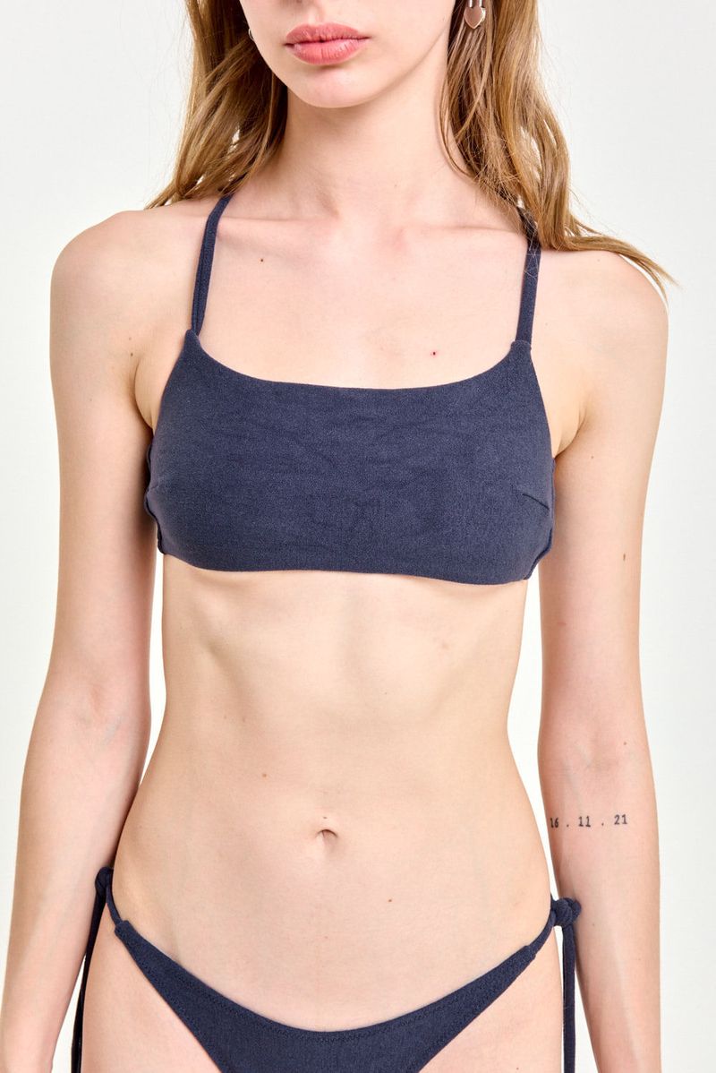 Bikini top con espalda cruzada y tiras regulables con chapita personalizada. Bombacha con chapa de marca en espalda. De textura suave y elástica, ideal para combinar con prendas de playa.