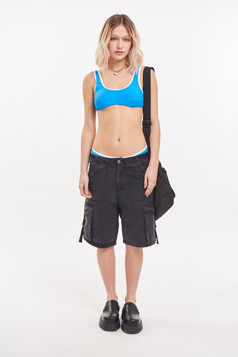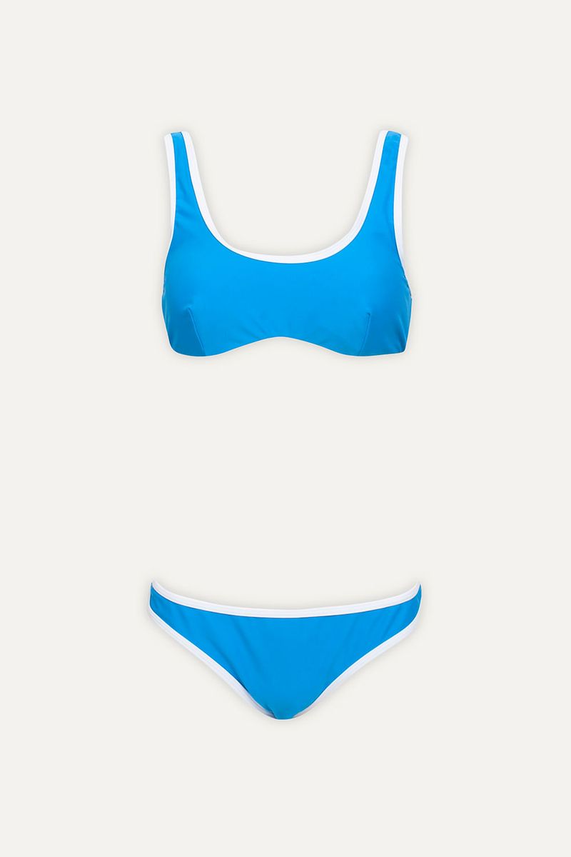 Bikini de dos piezas combinada con detalle de vivos en borde a contra tono. Parte superior tipo top con pinzas en busto. Parte inferior vedetina. Etiquetería marcaria "47street"