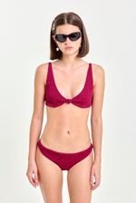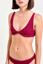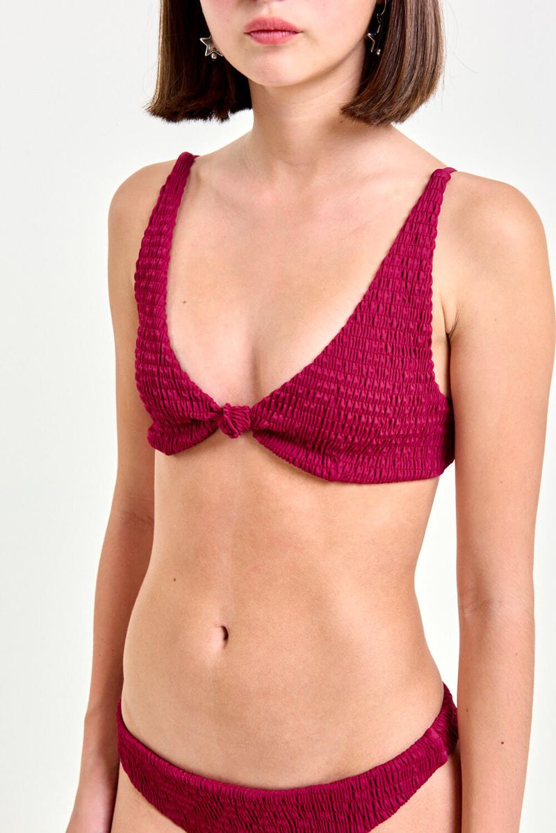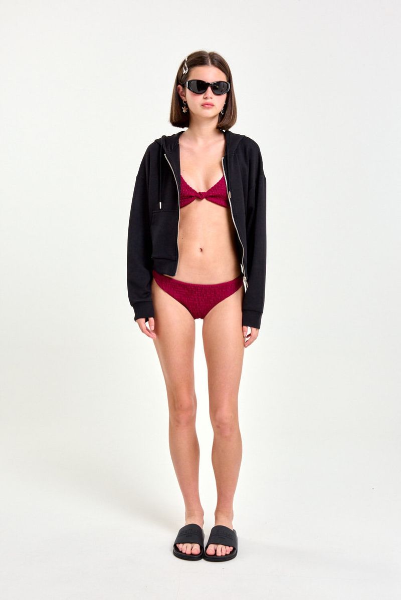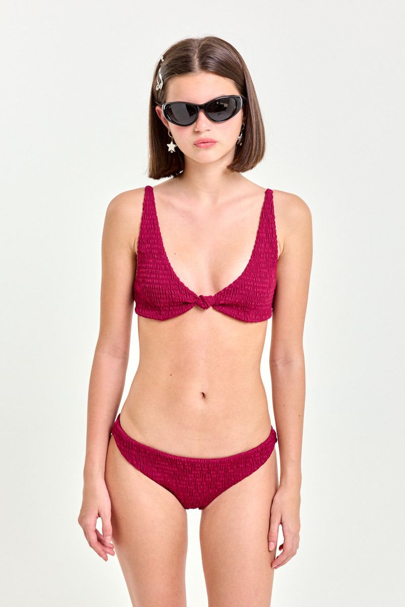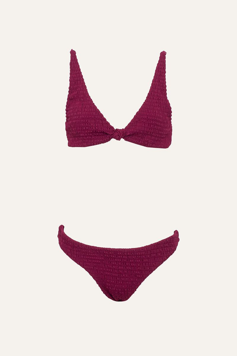 Bikini con estampa exclusiva de la marca y textura suave al tacto. Top con nudo frontal y bombacha con chapa marcaria en espalda. Su tejido elástico acompaña el movimiento brindando confort.