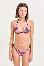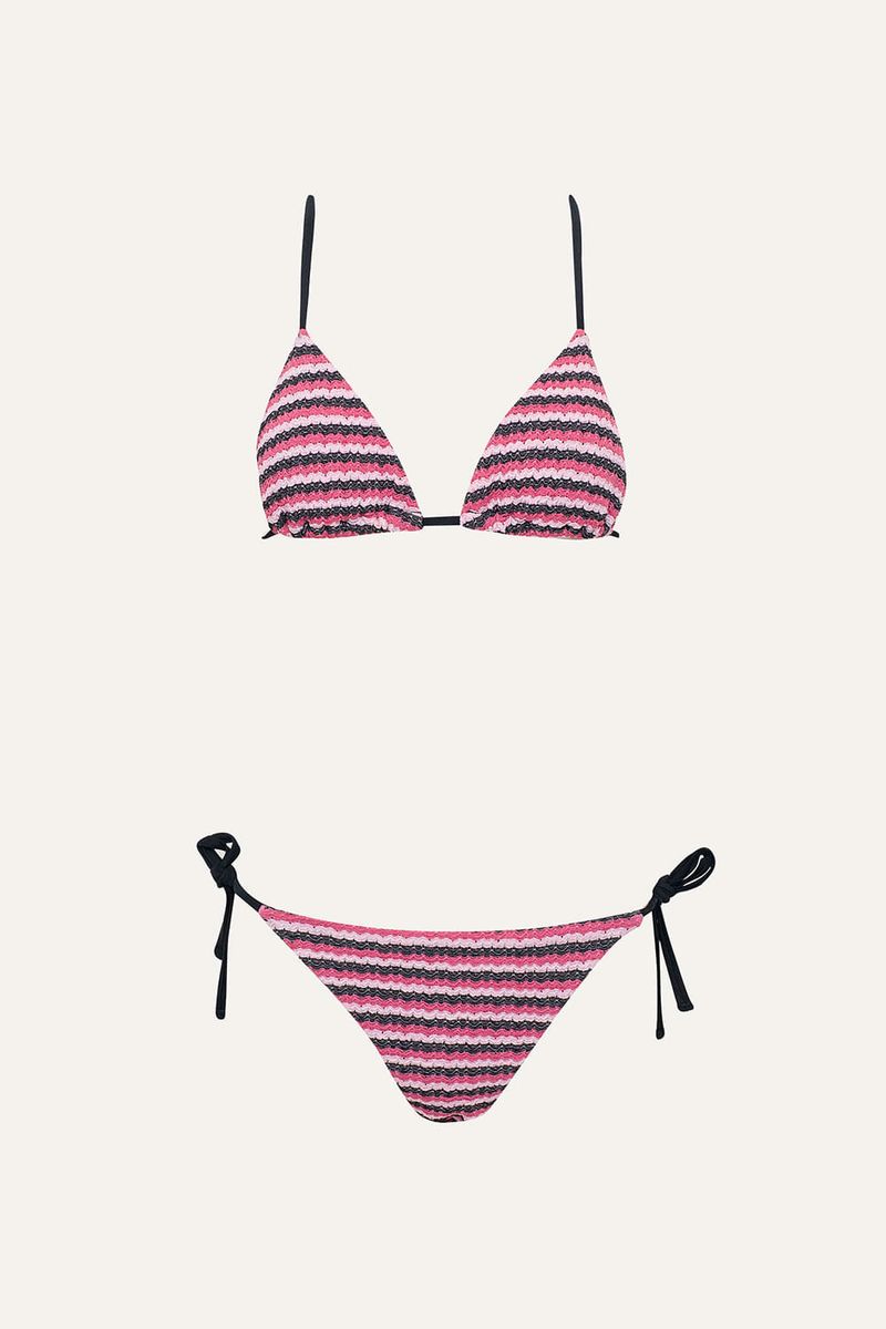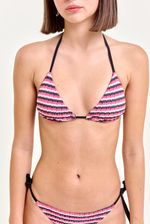 Bikini triángulo con textura, interior en tela negra y breteles ajustables con herrajes metálicos personalizados. Chapita marcaria en espalda. Su diseño favorecedor y tejido suave lo convierten en una opción ideal para la temporada.