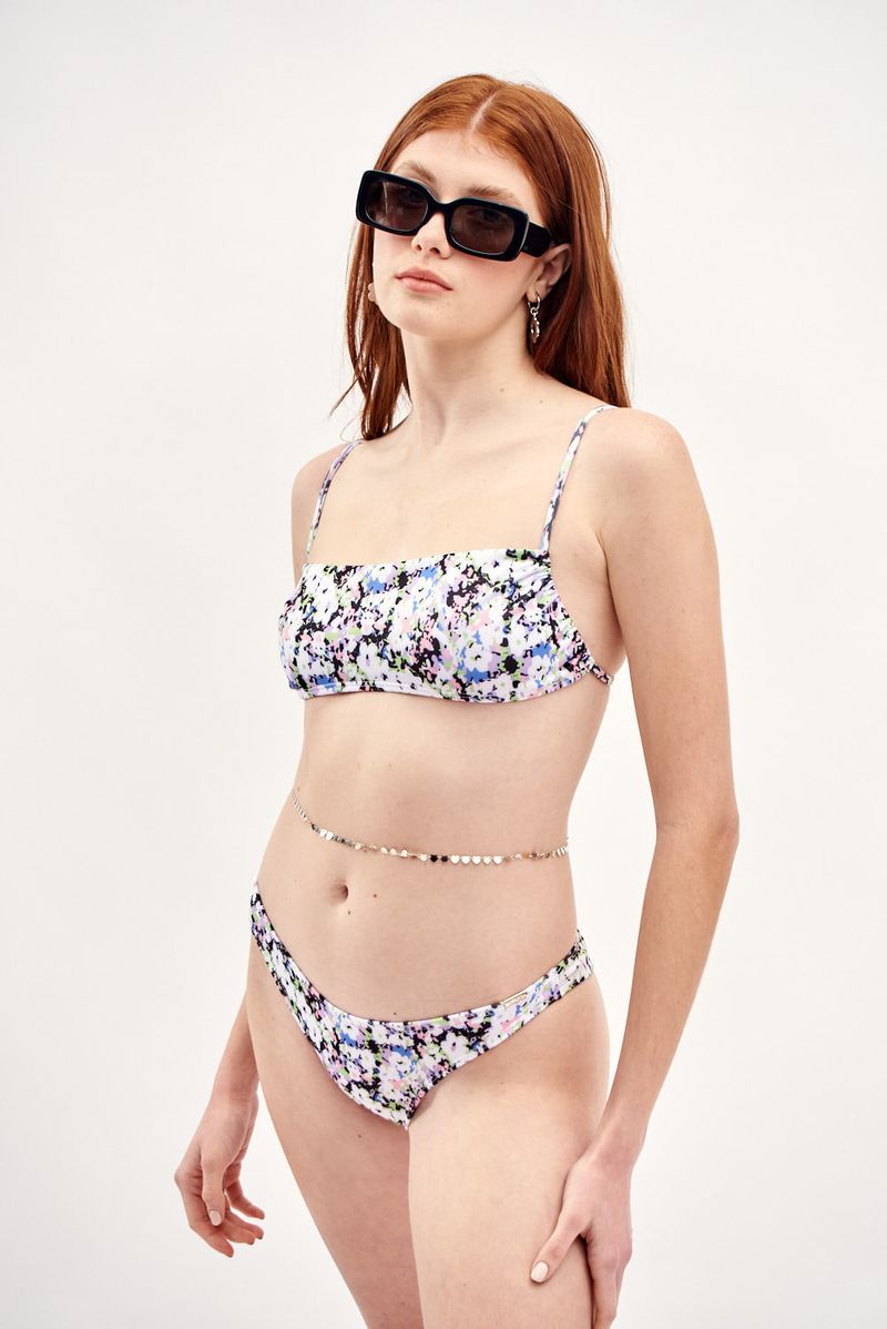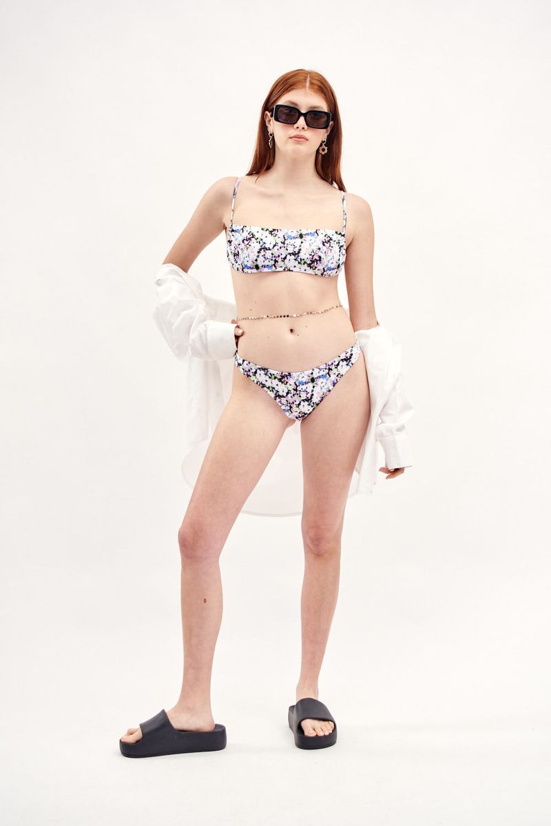 Bikini con estampa floreada, parte superior top con breteles ajustables, parte de abajo vedetina con insignia de la marca.
