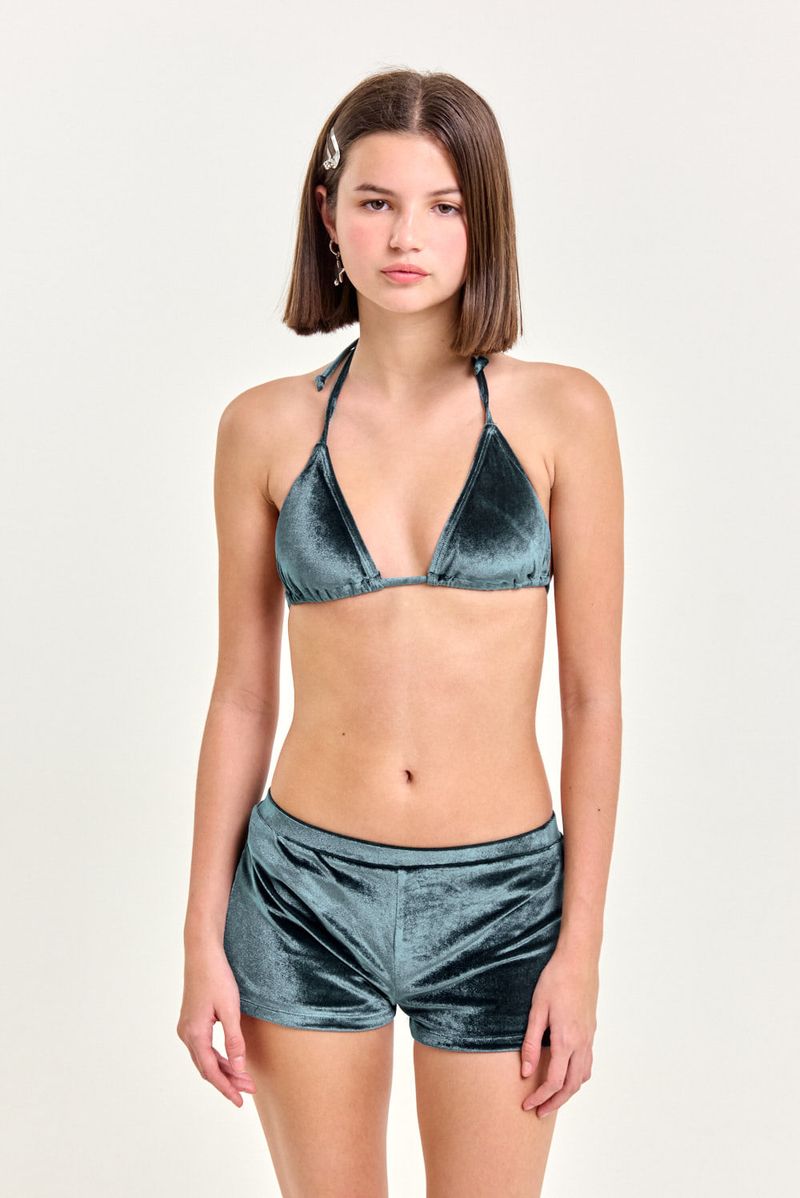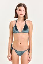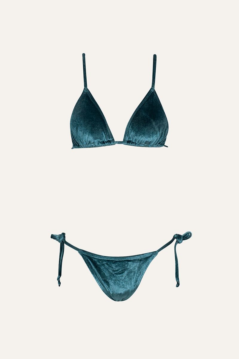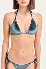 Bikini triángulo de textura tipo terciopelo, con frunce en espalda de la vedetina y ajuste mediante tiras regulables. De estilo moderno y tacto suave, ideal para días de sol con un toque distinto.
