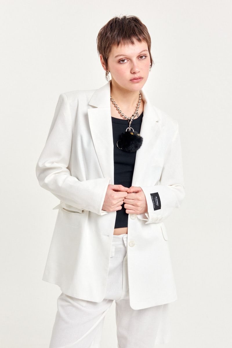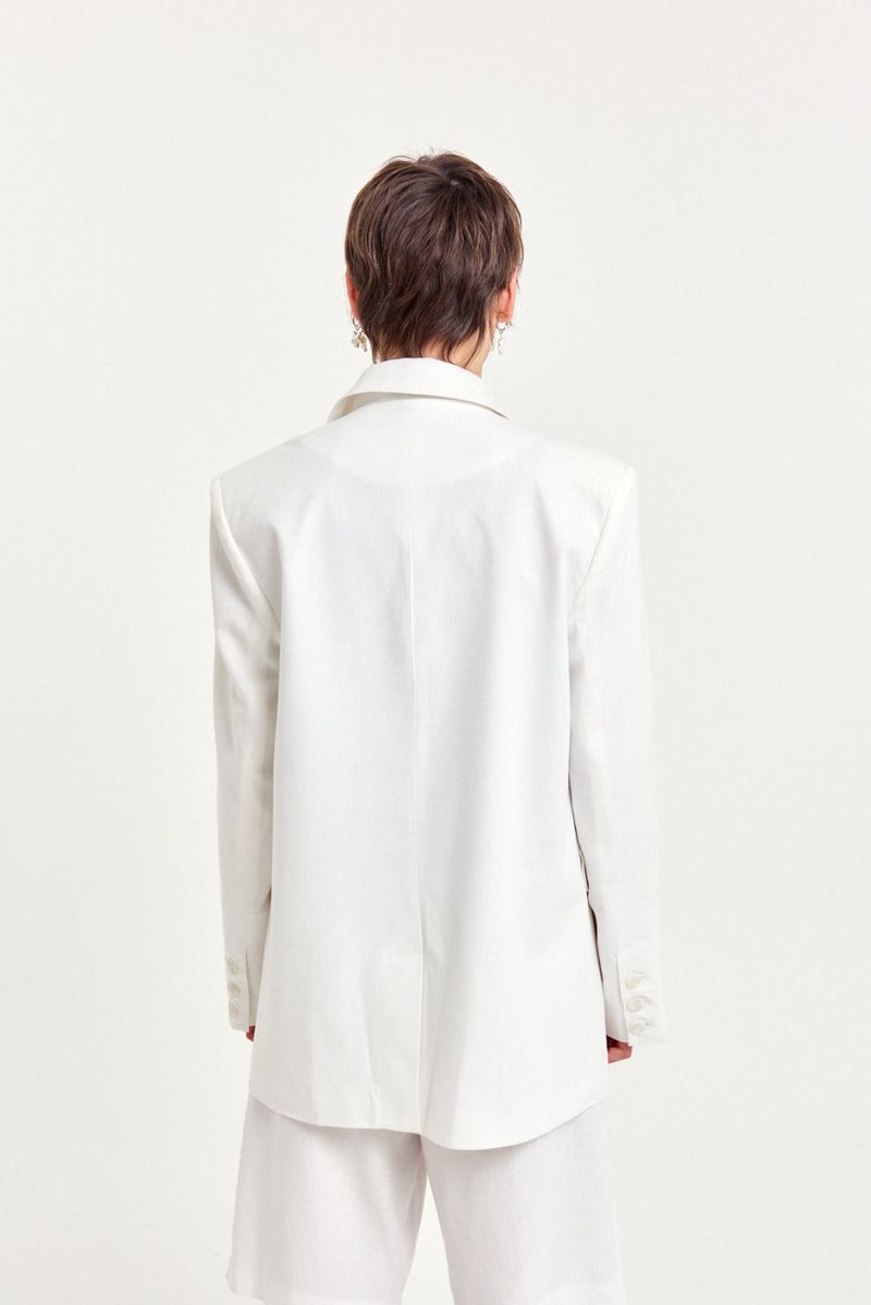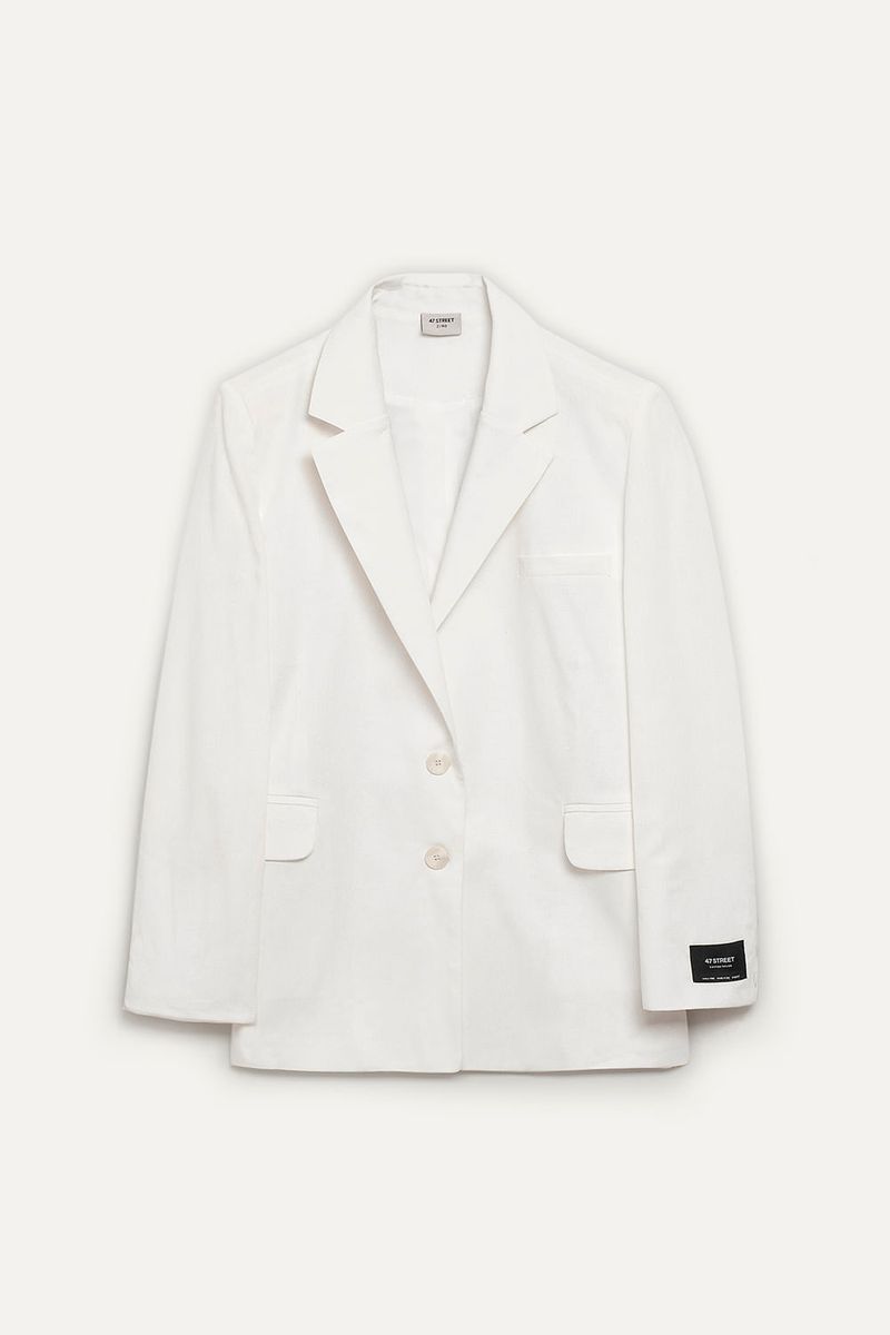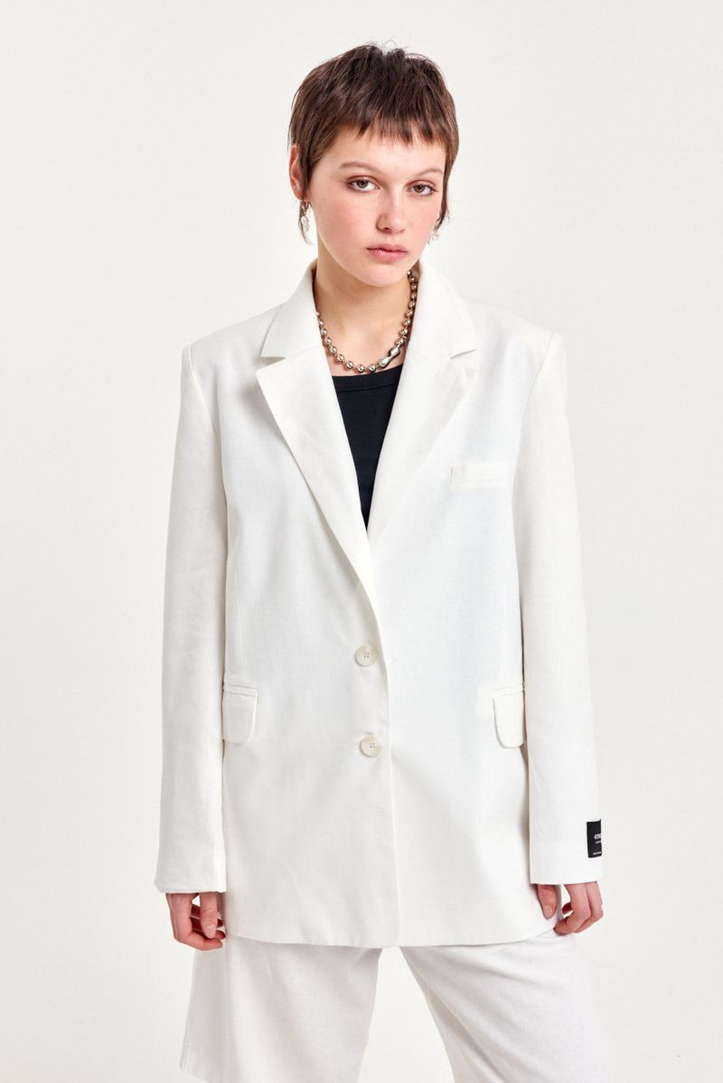 Blazer sastrero de lino mezcla, calce regular con hombreras y estructura armada. Lleva solapas rectas, bolsillos delanteros con tapa y espalda con tajo central. Cierra con botones al frente y detalle de etiqueta exclusiva de sastreria en el interior. Versátil y elegante, perfecto para combinar con pantalones sastreros o faldas midi.